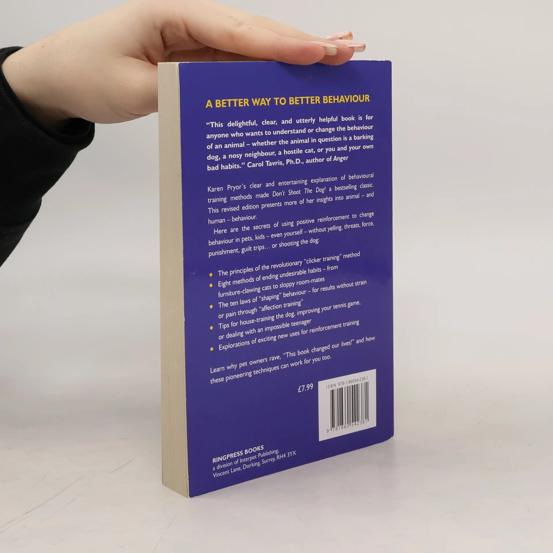 A Better Way to Better Behavior Karen Pryor's clear and entertaining explanation of behavioral training methods made Don't Shoot the Dog! a bestselling classic. Now this revised edition presents more of her insights into animal--and human--behavior. A groundbreaking behavioral scientist and dynamic animal trainer, Karen Pryor is a powerful proponent of the principles and practical uses of positive reinforcement in teaching new behaviors. Here are the secrets of changing behavior in pets, kids--even yourself--without yelling, threats, force, punishment, guilt trips...or shooting the dog: *The principles of the revolutionary "clicker training" method, which owes its phenomenal success to its immediacy of response--so there is no question what action you are rewarding *8 methods of ending undesirable habits--from furniture-clawing cats to sloppy roommates *The 10 laws of "shaping" behavior-for results without strain or pain through "affection training" *Tips for house-training the dog, improving your tennis game, or dealing with an impossible teen *Explorations of exciting new uses for reinforcement training Learn why pet owners rave, "This book changed our lives!" and how these pioneering techniques can work for you too.