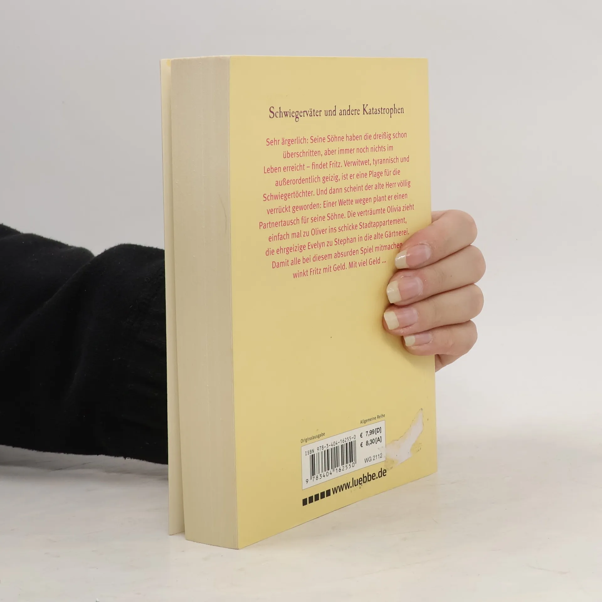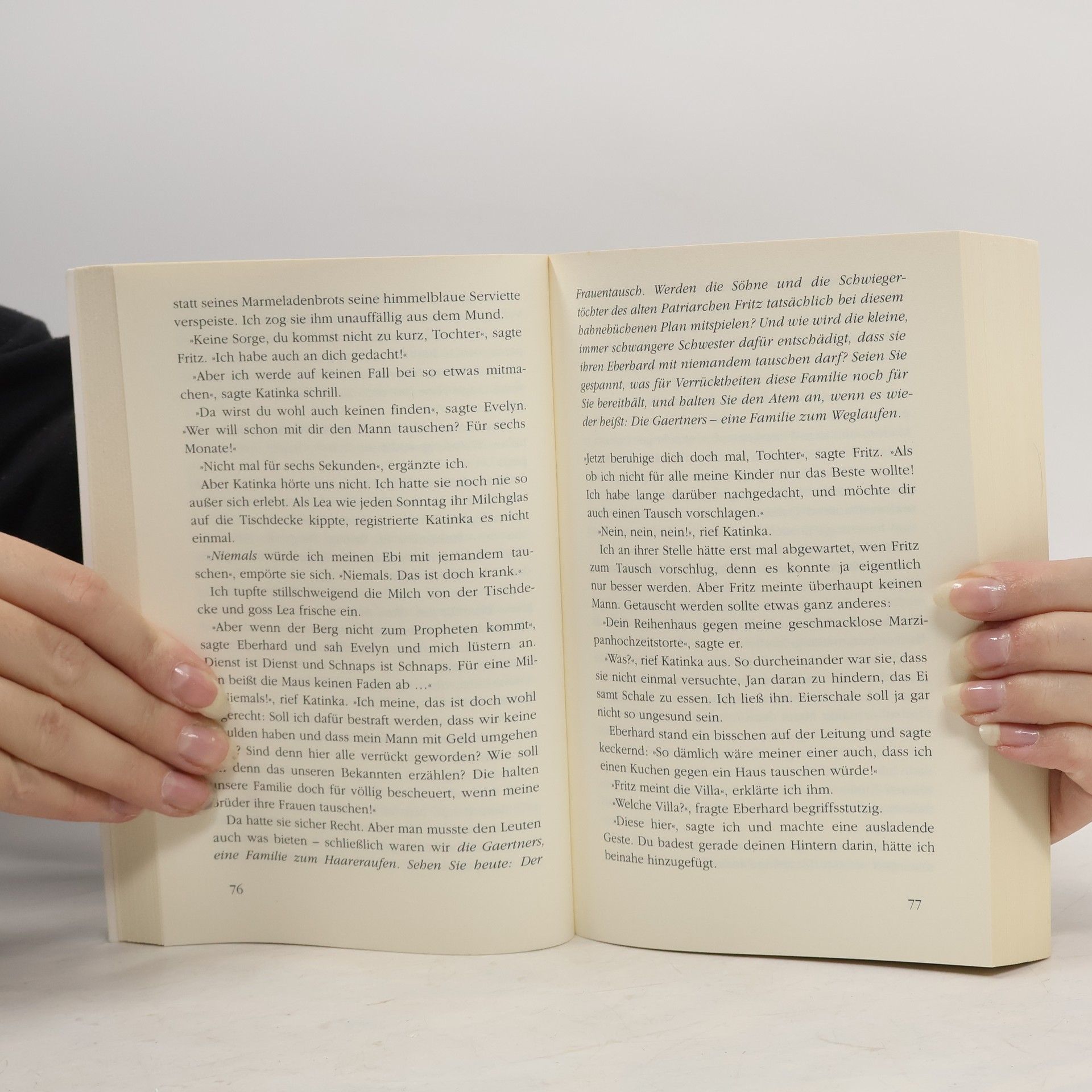 Sehr ärgerlich: Seine Söhne haben die dreißig schon überschritten, aber immer noch ist kein Enkelkind in Sicht. Fritz, verwitwet, tyrannisch und außerordentlich geizig, ist eine Plage für die Schwiegertöchter. Und dann scheint der alte Herr völlig verrückt geworden: Damit die Söhne endlich begreifen, was sie an ihren Frauen haben und wie gut sie zueinander passen, sollen sie ein halbes Jahr die Partner tauschen. Die verträumte Olivia zieht einfach mal zu Bastian ins schicke Stadtappartment, die ehrgeizige Conny zu Stephan in die alte Gärtnerei. – Damit alle bei diesem absurden Spiel mitmachen, winkt Fritz mit Geld. Mit viel Geld ...