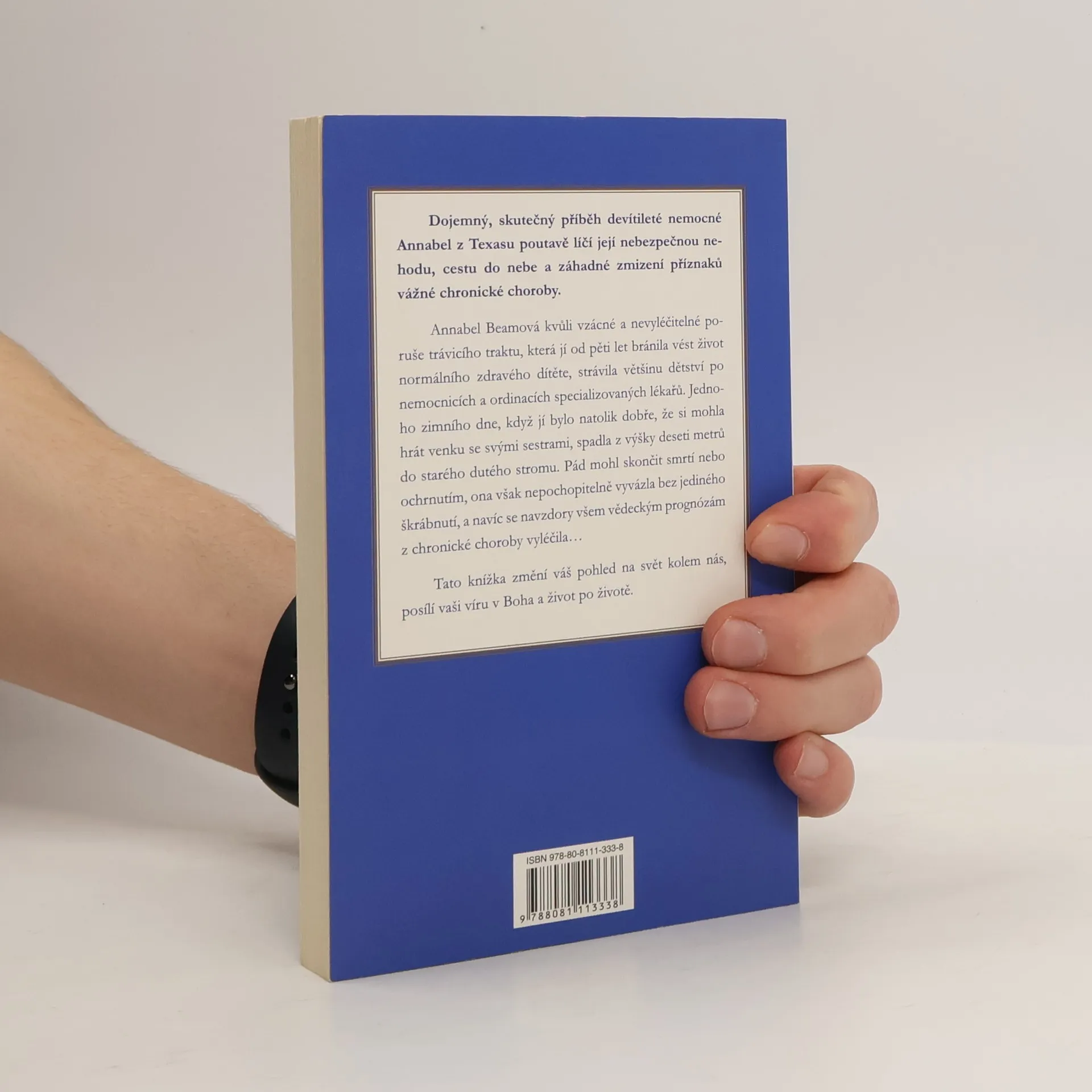 Dojemný, skutečný příběh devítileté nemocné Annabel z Texasu poutavě líčí její nebezpečnou nehodu, cestu do nebe a záhadné zmizení příznaků vážné chronické choroby. Annabel Beamová kvůli vzácné a nevyléčitelné poruše trávicího traktu, která jí od pěti let bránila vést život normálního zdravého dítěte, strávila většinu dětství po nemocnicích a ordinacích specializovaných lékařů. Jednoho zimního dne, když jí bylo natolik dobře, že si mohla hrát venku se svými sestrami, spadla z výšky deseti metrů do starého dutého stromu. Pád mohl skončit smrtí nebo ochrnutím, ona však nepochopitelně vyvázla bez jediného škrábnutí, a navíc se navzdory všem vědeckým prognózám z chronické choroby vyléčila… Tato knížka změní váš pohled na svět kolem nás, posílí vaši víru v Boha a život po životě.