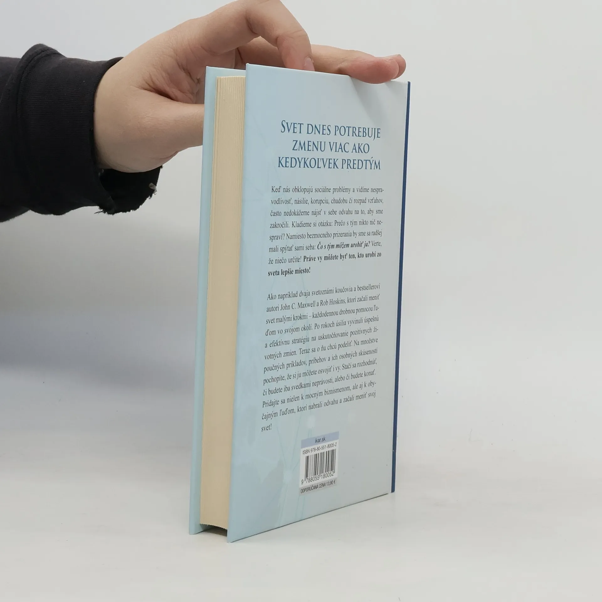 Keď nás obklopujú sociálne problémy a vidíme nespravodlivosť, násilie, korupciu, chudobu či rozpad vzťahov, často nedokážeme nájsť v sebe odvahu na to, aby sme zakročili. Kladieme si otázku: Prečo s tým nikto nič nespraví? Namiesto bezmocného prizerania by sme sa radšej mali spýtať sami seba: Čo s tým môžem urobiť ja? Verte, že niečo určite! Práve vy môžete byť ten, kto urobí zo sveta lepšie miesto! Ako napríklad dvaja svetoznámi koučovia a bestselleroví autori John C. Maxwell a Rob Hoskins, ktorí začali meniť svet malými krokmi - každodennou drobnou pomocou ľuďom vo svojom okolí. Po rokoch úsilia vyvinuli úspešnú a efektívnu stratégiu na uskutočňovanie pozitívnych životných zmien. V knihe Zmeňte svoj svet sa chcú o túto stratégiu podeliť. Na množstve poučných príkladov, príbehov a ich osobných skúseností pochopíte, že si ju môžete osvojiť i vy. Stačí sa rozhodnúť, či budete iba svedkami neprávosti, alebo či budete konať. Pridajte sa nielen k mocným biznismenom, ale aj k obyčajným ľuďom, ktorí nabrali odvahu a začali meniť svoj svet!