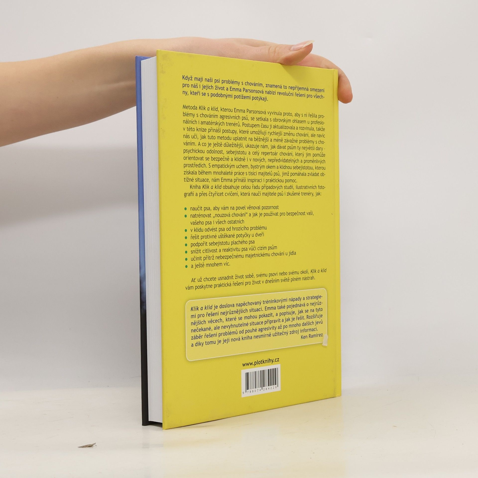 Text obsahuje postupy, které pomáhají řešit problematické chování různorodé povahy u psů, a to v rámci metody autorky "Klik a klid".Ukazuje, jak dávat psům ty největší dary – psychickou odolnost, sebejistotu a celý repertoár chování, který jim pomůže orientovat se bezpečně a klidně i v nových, nepředvídatelných a proměnlivých prostředích. Kniha obsahuje celou řadu případových studií, ilustrativních fotografií a přes čtyřicet cvičení, která naučí majitele psů i zkušené trenéry, jak: naučit psa, aby vám na povel věnoval pozornost, natrénovat „nouzová chování“.