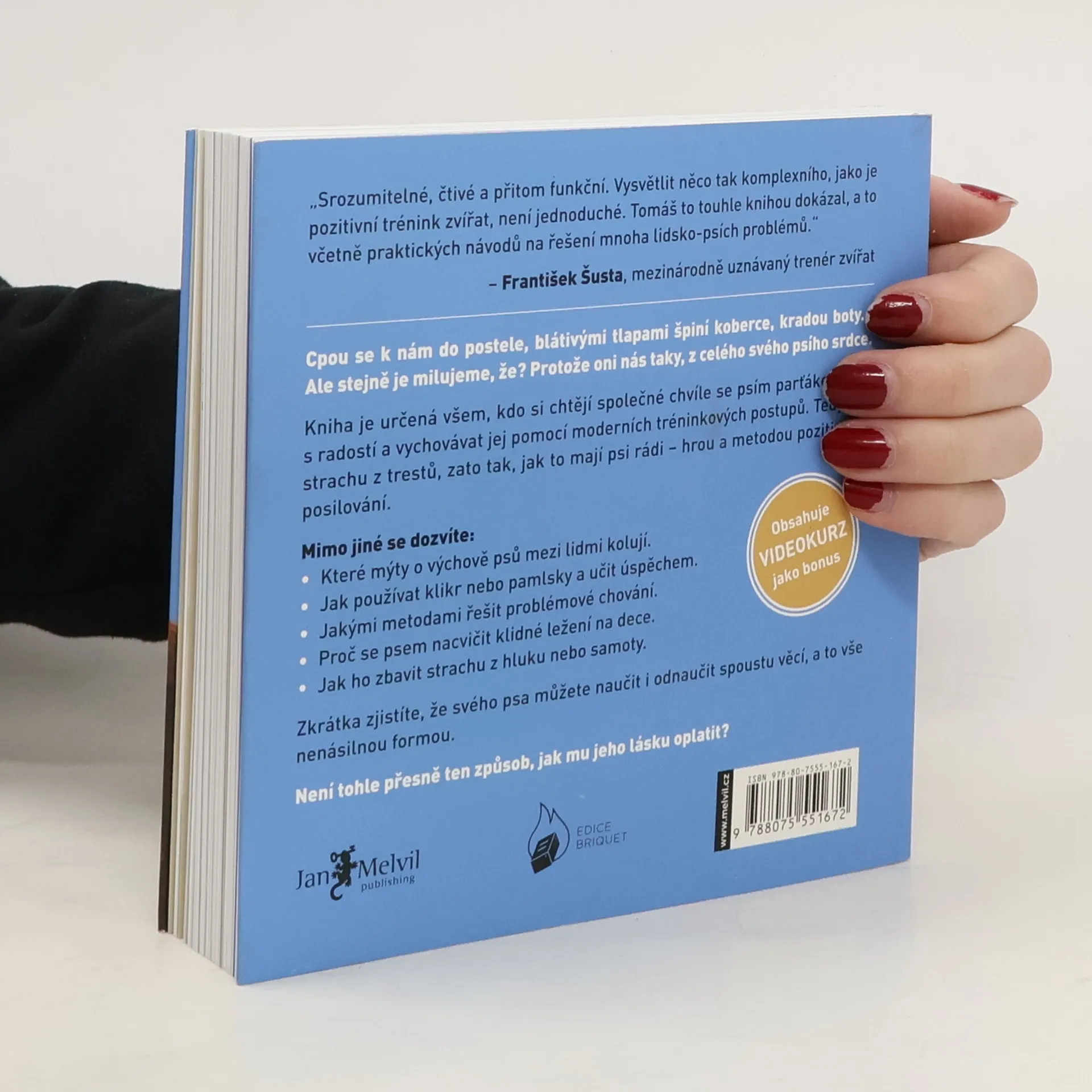 Manuál láskyplné a efektivní výchovy.Cpou se k nám do postele, blátivými tlapami špiní koberce, kradou boty… Ale stejně je milujeme, že? Protože oni nás taky, z celého svého psího srdce. Kniha je určena všm, kdo si chtějí společné chvíle se psím parťákem užít s radostí a vychovávat jej pomocí moderních tréninkových postupů. Tedy bez strachu z trestů, zato tak, jak to mají psi rádi – hrou a metodou pozitivního posilování. Mimo jiné se dozvíte: které mýty o výchově psů mezi lidmi kolují, jak používat klikr nebo pamlsky a učit úspěchem, jakými metodami řešit problémové chování, proč se psem nacvičit klidné ležení na dece a jak ho zbavit strachu z hluku nebo samoty. Zkrátka zjistíte, že svého psa můžete naučit i odnaučit spoustu věcí, a to vše nenásilnou formou. Není tohle přesně ten způsob, jak mu jeho lásku oplatit?