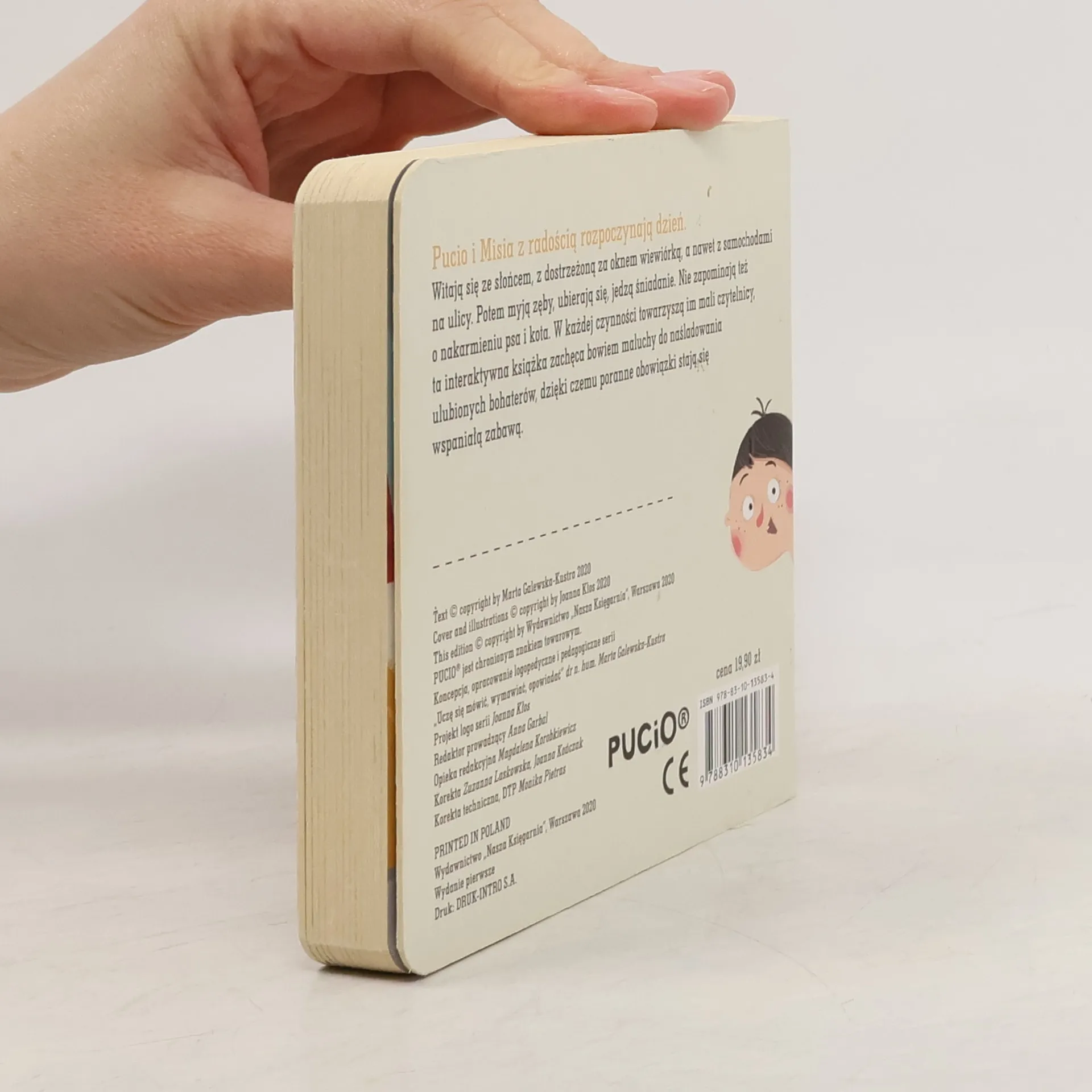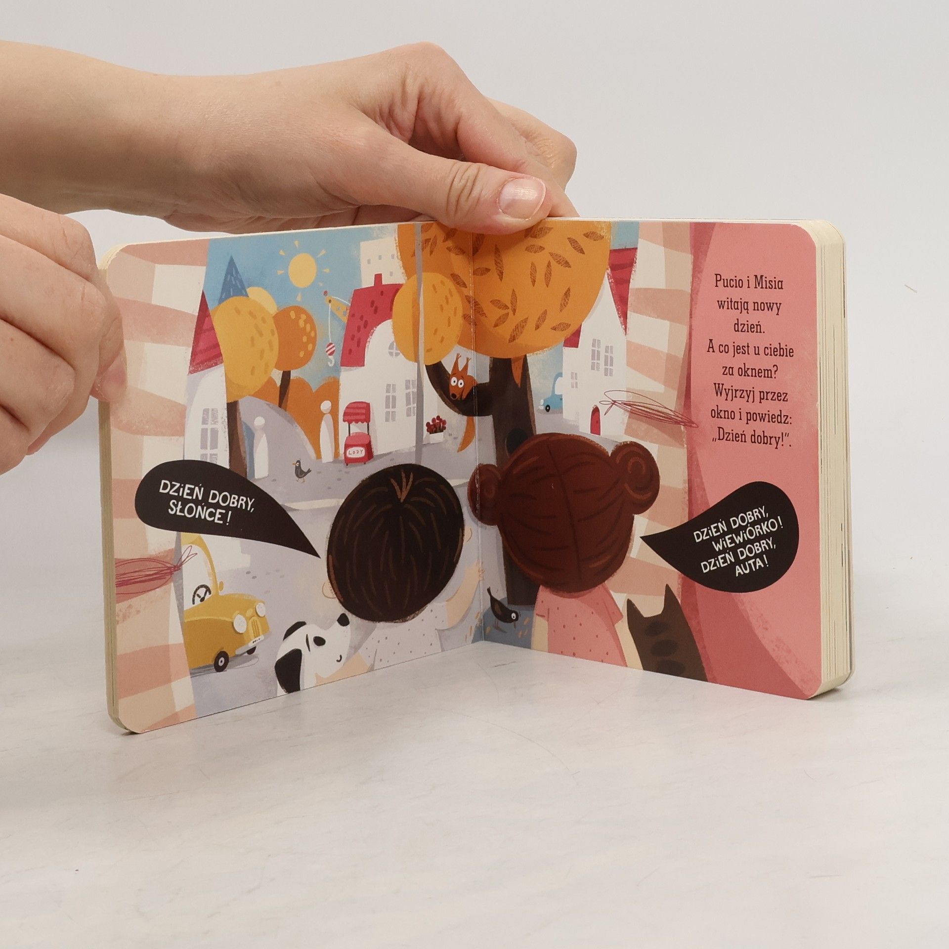 Pucio i Misia z radością rozpoczynają dzień. Witają się ze słońcem, dostrzeżoną za oknem wiewiórką, a nawet samochodami na ulicy. Potem myją zęby, ubierają się, jedzą śniadanie. Nie zapominają też o nakarmieniu psa i kota.W każdej czynności towarzyszą im mali czytelnicy, ta interaktywna książka zachęca bowiem maluchy do naśladowania ulubionych bohaterów, dzięki czemu poranne obowiązki stają się wspaniałą zabawą.