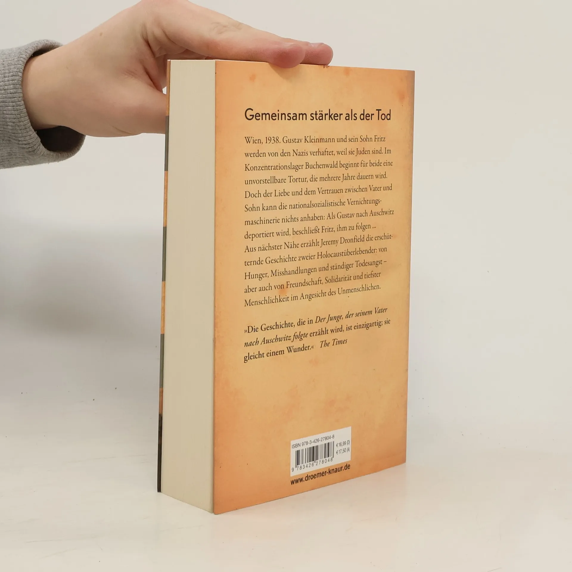 Fritz Kleinmann trifft eine unglaubliche Entscheidung: Er folgt seinem Vater Gustav nach Auschwitz, um ihn nicht allein zu lassen. Jeremy Dronfields Bestseller ist ein eindringliches Plädoyer gegen das Vergessen, basierend auf den geheimen Tagebüchern des jüdischen KZ-Häftlings Gustav Kleinmann. Die Geschichte von Gustav und Fritz, die den Nazis entkommen, ist geprägt von unermesslicher Grausamkeit, aber auch von Menschlichkeit, Mut und Hoffnung. Im Jahr 1939 werden Gustav, ein jüdischer Polsterer aus Wien, und sein sechzehnjähriger Sohn Fritz von der SS festgenommen und aus ihrer Familie gerissen. Zunächst nach Deutschland deportiert, werden sie im KZ Buchenwald zur Zwangsarbeit im Steinbruch eingesetzt und tragen zum Aufbau des Lagers bei. Gustav wird schließlich für die Deportation nach Auschwitz selektiert. Für Fritz ist der Gedanke, von seinem Vater getrennt zu werden, unerträglich. Trotz des Wissens, dass niemand aus Auschwitz zurückkehrt, erklärt er sich bereit, seinen Vater zu begleiten. Dies markiert den Beginn eines Leidenswegs, der noch brutaler und hoffnungsloser ist als alles, was sie bisher erlebt haben – doch Vater und Sohn überstehen ihn gemeinsam. Die erzählte Geschichte ist einzigartig und erschütternd, da sie auf wahren Begebenheiten basiert und verdient eine breite Leserschaft.