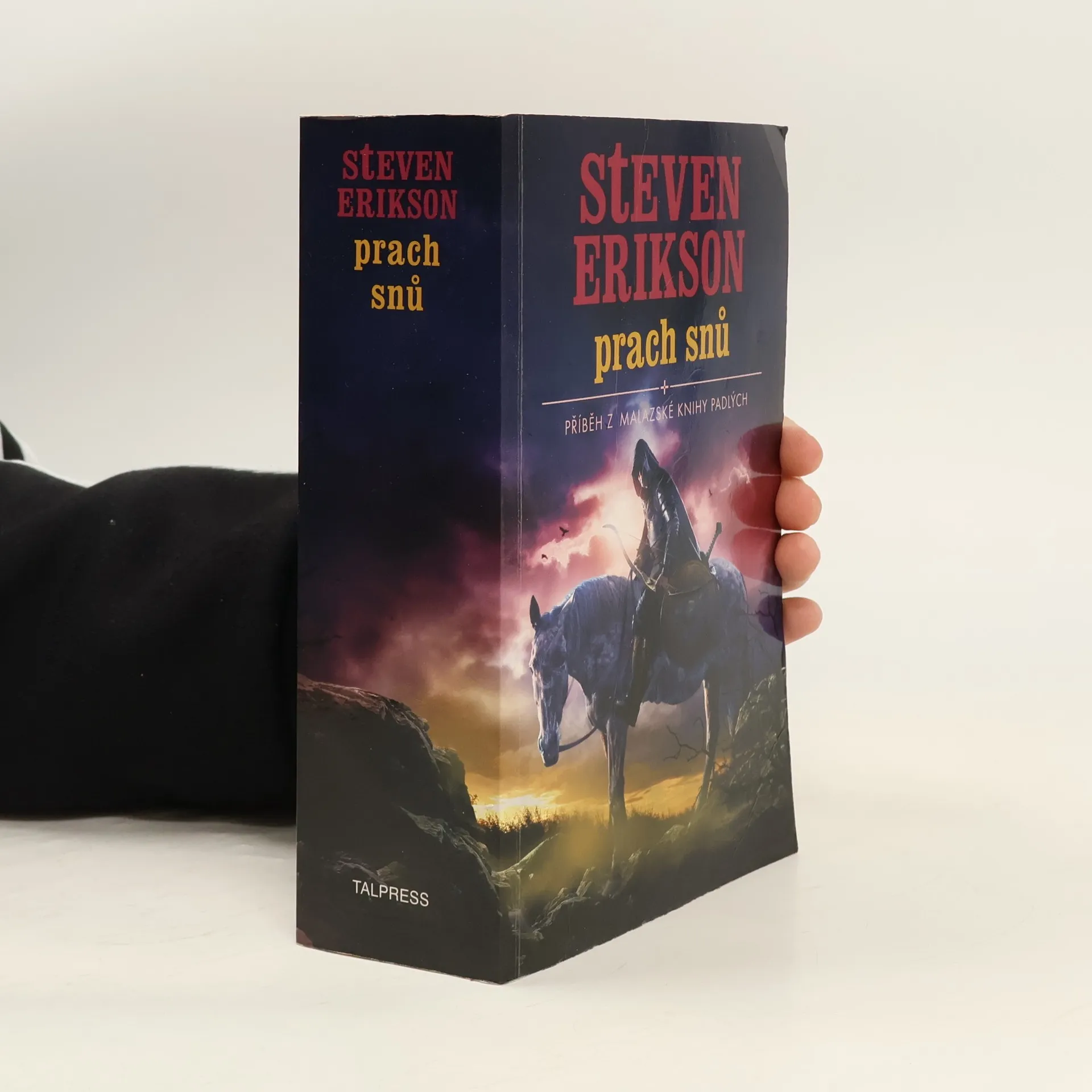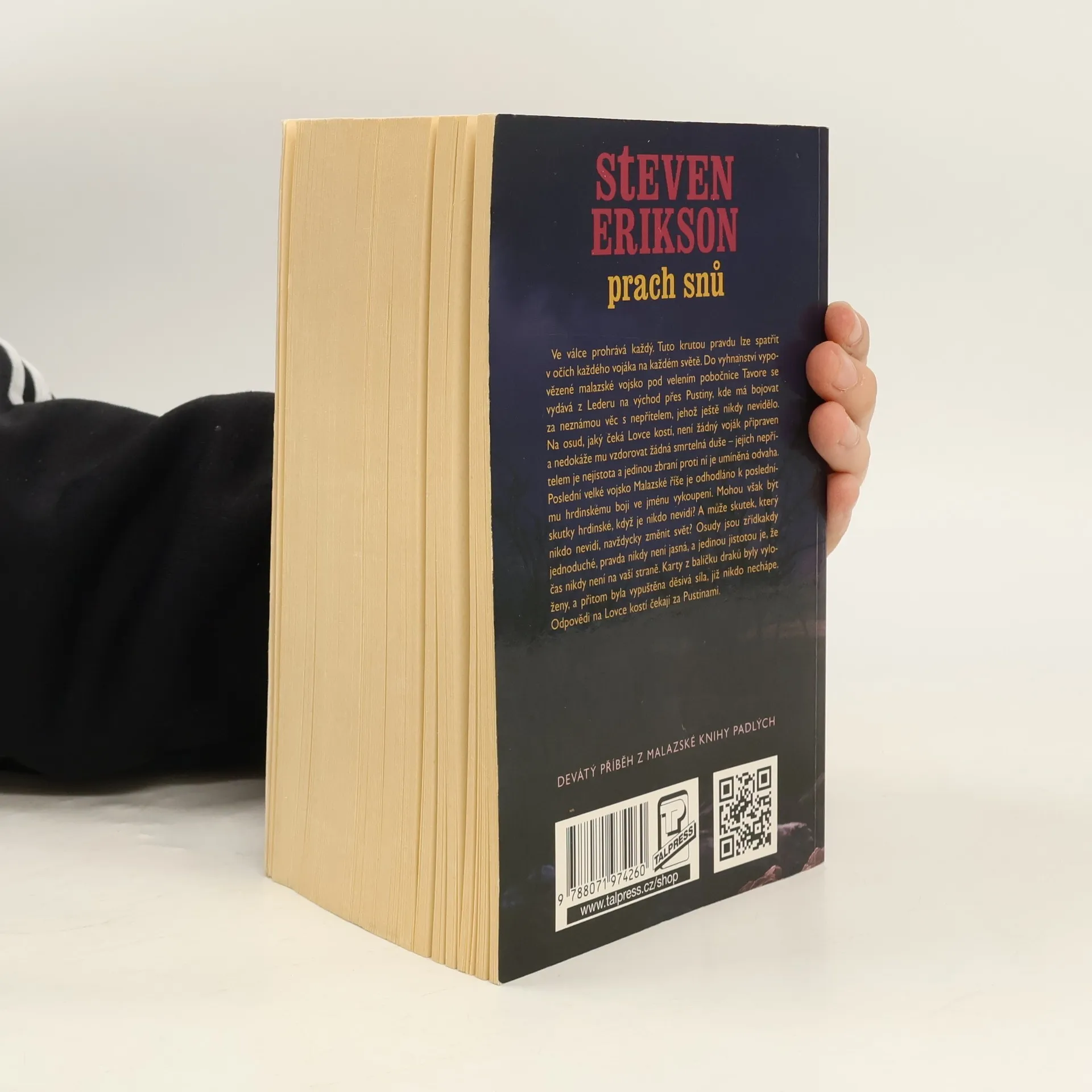 Prach snů, devátá kniha z fantasy série malazská Kniha padlých. Ve válce prohrává každý. Tuto krutou pravdu lze spatřit v očích každého vojáka na každém světě. Do vyhnanství vypovězené malazské vojsko pod velením pobočnice Tavore se vydává z Lederu na východ přes Pustiny, kde má bojovat za neznámou věc s nepřítelem, jehož ještě nikdy nevidělo. Na osud, jaký čeká Lovce kostí, není žádný voják připraven a nedokáže mu vzdorovat žádná smrtelná duše – jejich epřítelem je nejistota a jedinou zbraní proti ní je umíněná odvaha. Poslední velké vojsko Malazské říše je odhodláno k poslednímu hrdinskému boji ve jménu vykoupení. Mohou však být skutky hrdinské, když je nikdo nevidí? A může skutek, který nikdo nevidí, navždycky změnit svět? Osudy jsou zřídkakdy jednoduché, pravda nikdy není jasná, a jedinou jistotou je, že čas nikdy není na vaší straně. Karty z balíčku draků byly vyloženy, a přitom byla vypuštěna děsivá síla, již nikdo nechápe. Odpovědi na Lovce kostí čekají za Pustinami.