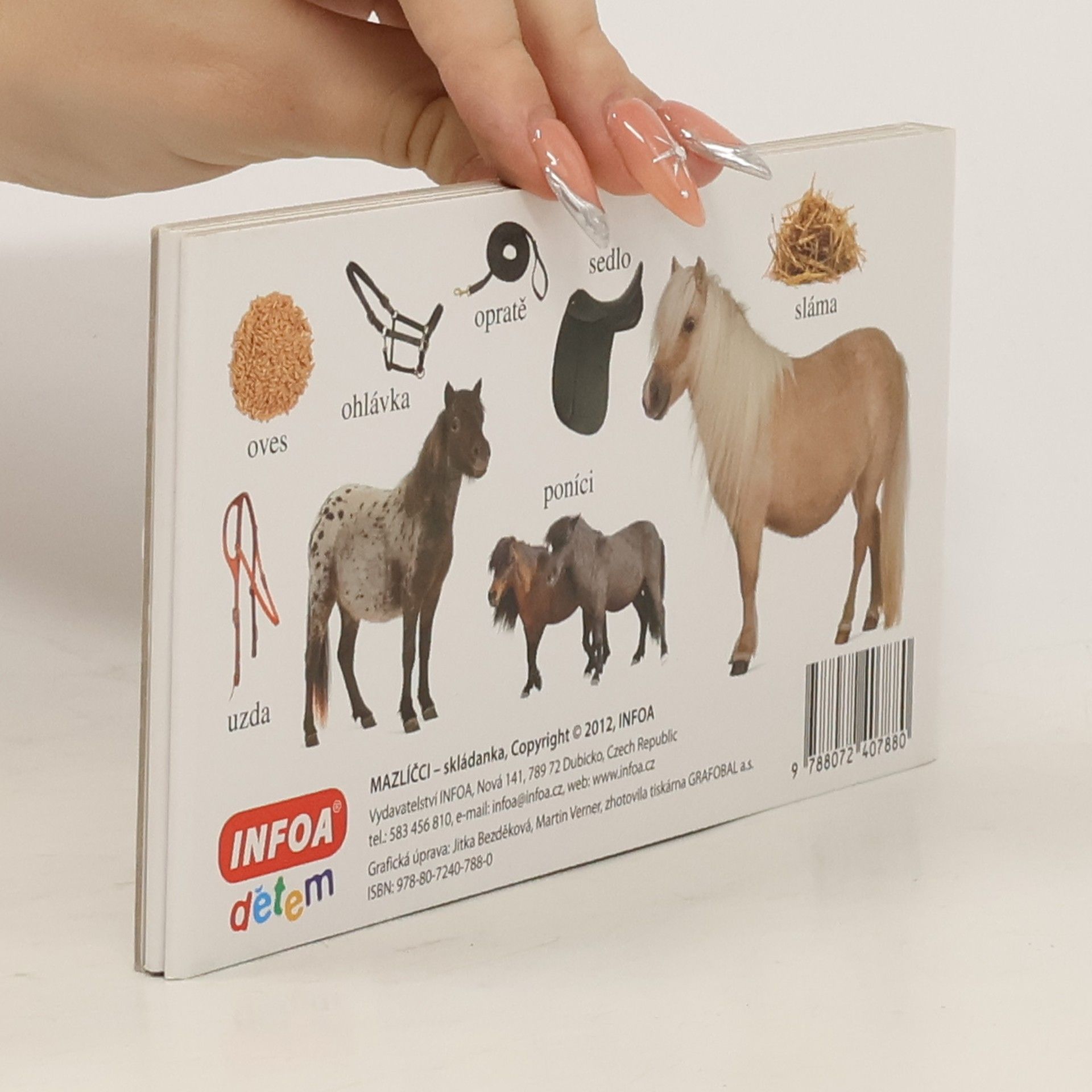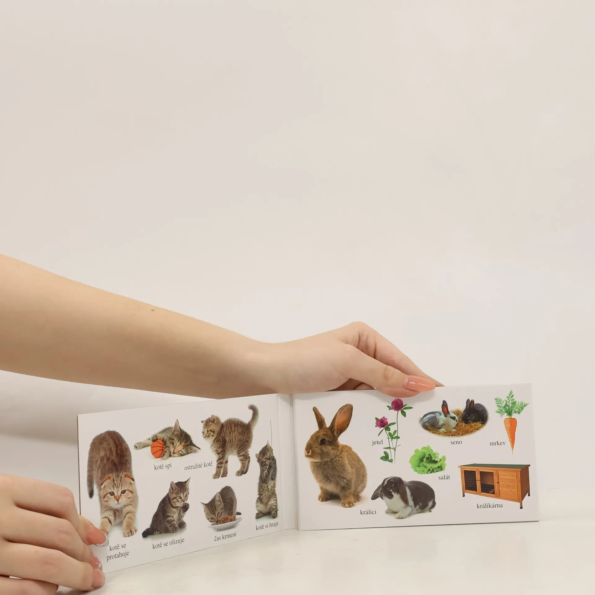Barevné rozkládací leporelo pro děti s mnoha barevnými fotografiemi zvířat.