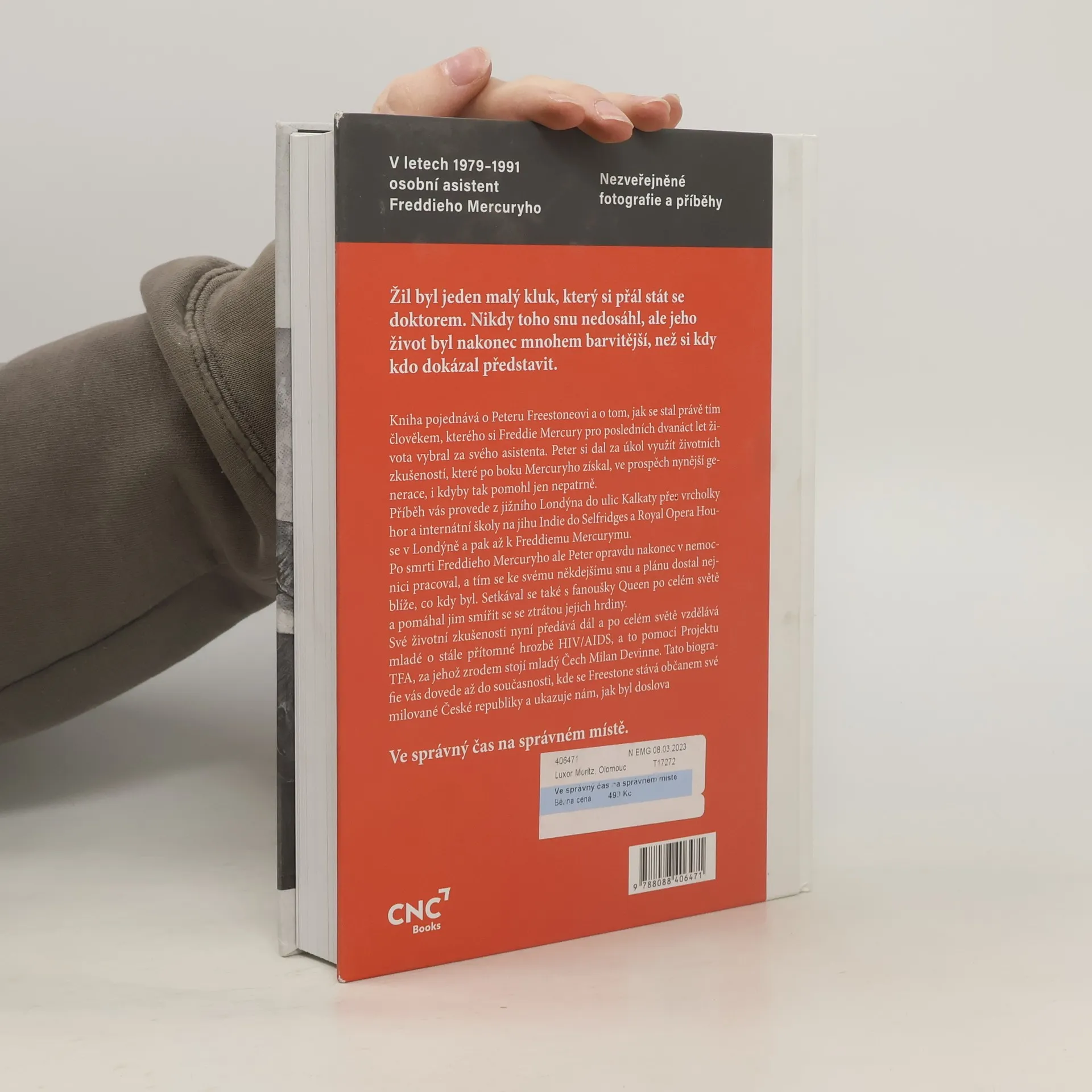 Kniha pojednává o Peteru Freestoneovi a o tom, jak se stal právě tím člověkem, kterého si Freddie Mercury pro posledních dvanáct let života vybral za svého asistenta. Peter si dal za úkol využít životních lekcí, které mu byly uštědřeny po boku Mercuryho, ve prospěch nynější generace, i kdyby díky nim měl být jejich život jen o maličko únosnější. I touto cestou vás kniha provede. Z jižního Londýna, do ulic Kalkaty, přes vrcholky hor a internátní školy na jihu Indie do Selfridges a Royal Opera House v Londýně a pak až k Freddiemu Mercurymu. Po smrti Freddieho Mercuryho Peter nějakou dobu pracoval v nemocnici, a tím se ke svému někdejšímu snu a plánu stát se doktorem dostal nejblíže, co kdy byl. Setkával se také s fanoušky Queen po celém světě a pomáhal jim smířit se se ztrátou jejich hrdiny. Své životní zkušenosti nyní předává dál a po celém světě vzdělává dospívající o stále přítomné hrozbě HIV/AIDS, a to pomocí Projektu TFA, za jehož zrodem stojí mladý Čech Milan Devinne. Tato biografie vás dovede až do současnosti, kde se Freestone stává občanem své milované České republiky a ukazuje nám, jak byl doslova Ve správný čas na správném místě.