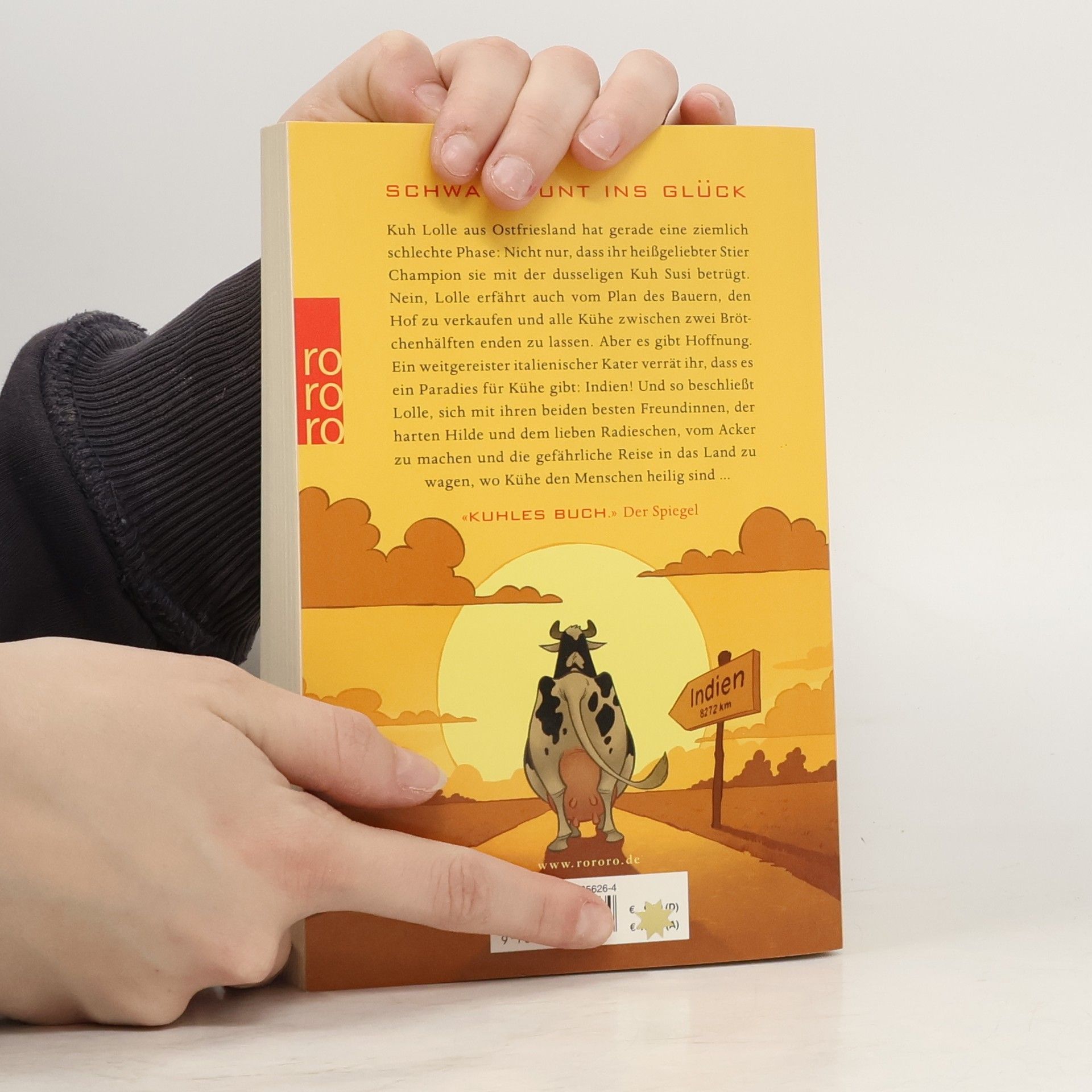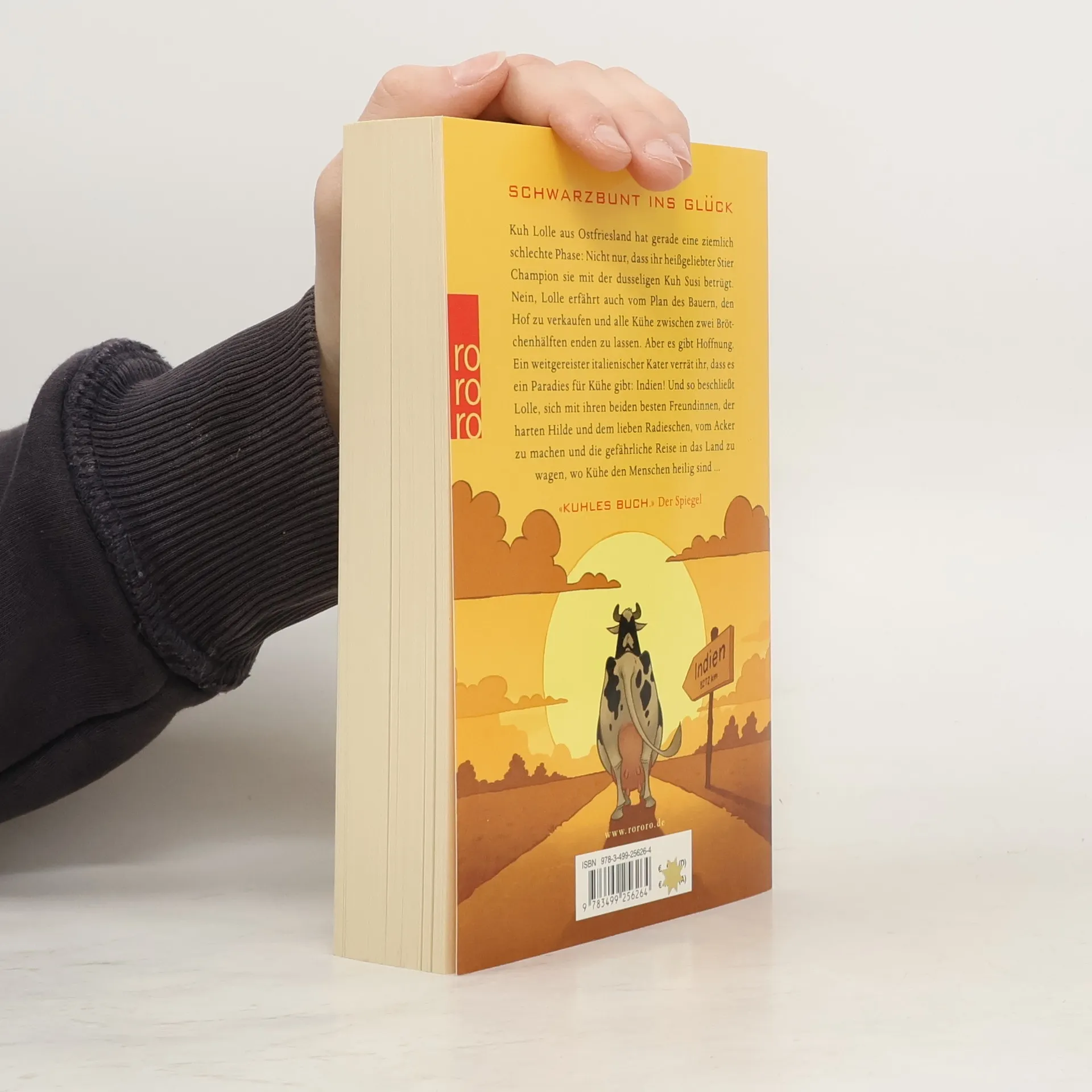 Schwarzbunt ins Glück. Kuh Lolle aus Ostfriesland hat gerade eine ziemlich schlechte Phase: Nicht nur, dass ihr heißgeliebter Stier Champion sie mit der dusseligen Kuh Susi betrügt. Nein, Lolle erfährt auch vom Plan des Bauern, den Hof zu verkaufen und alle Kühe zwischen zwei Brötchenhälften enden zu lassen. Aber es gibt Hoffnung. Ein weitgereister italienischer Kater verrät ihr, dass es ein Paradies für Kühe gibt: Indien! Und so beschließt Lolle, sich mit ihren beiden besten Freundinnen, der harten Hilde und dem lieben Radieschen, vom Acker zu machen und die gefährliche Reise in das Land zu wagen, wo Kühe den Menschen heilig sind ...