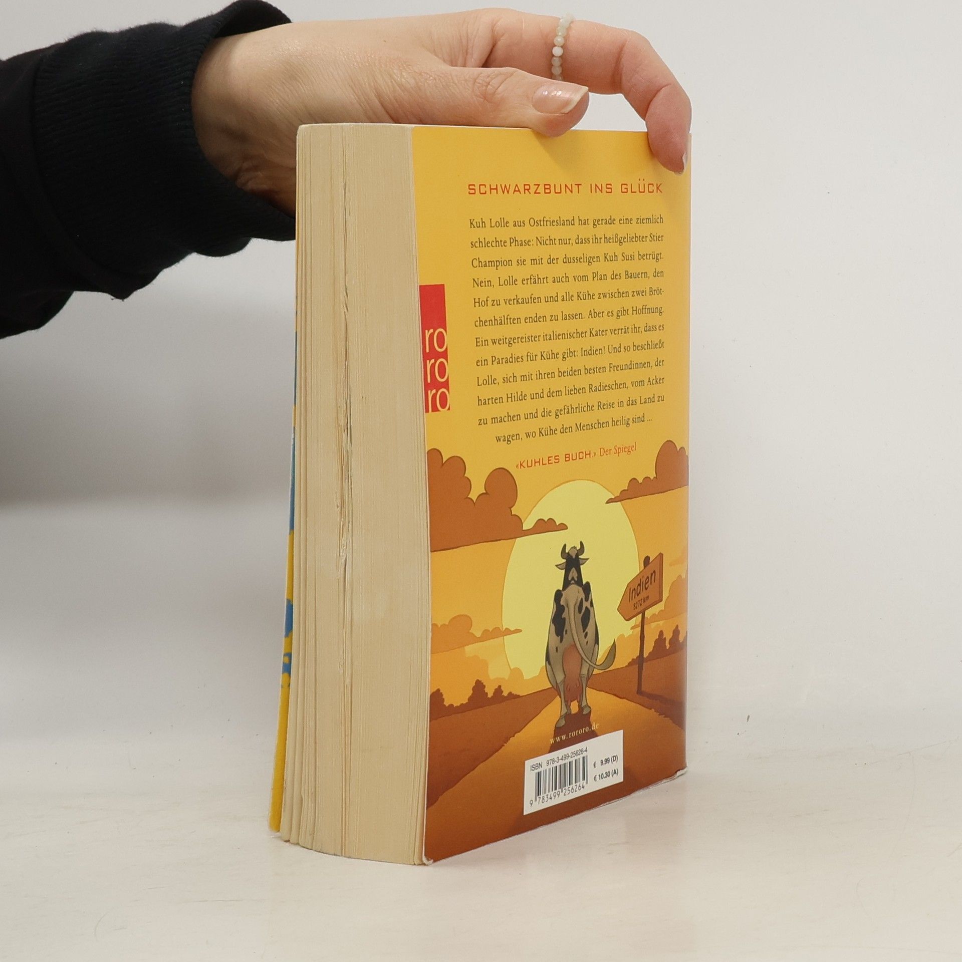 Schwarzbunt ins Glück. Kuh Lolle aus Ostfriesland hat gerade eine ziemlich schlechte Phase: Nicht nur, dass ihr heißgeliebter Stier Champion sie mit der dusseligen Kuh Susi betrügt. Nein, Lolle erfährt auch vom Plan des Bauern, den Hof zu verkaufen und alle Kühe zwischen zwei Brötchenhälften enden zu lassen. Aber es gibt Hoffnung. Ein weitgereister italienischer Kater verrät ihr, dass es ein Paradies für Kühe gibt: Indien! Und so beschließt Lolle, sich mit ihren beiden besten Freundinnen, der harten Hilde und dem lieben Radieschen, vom Acker zu machen und die gefährliche Reise in das Land zu wagen, wo Kühe den Menschen heilig sind ...