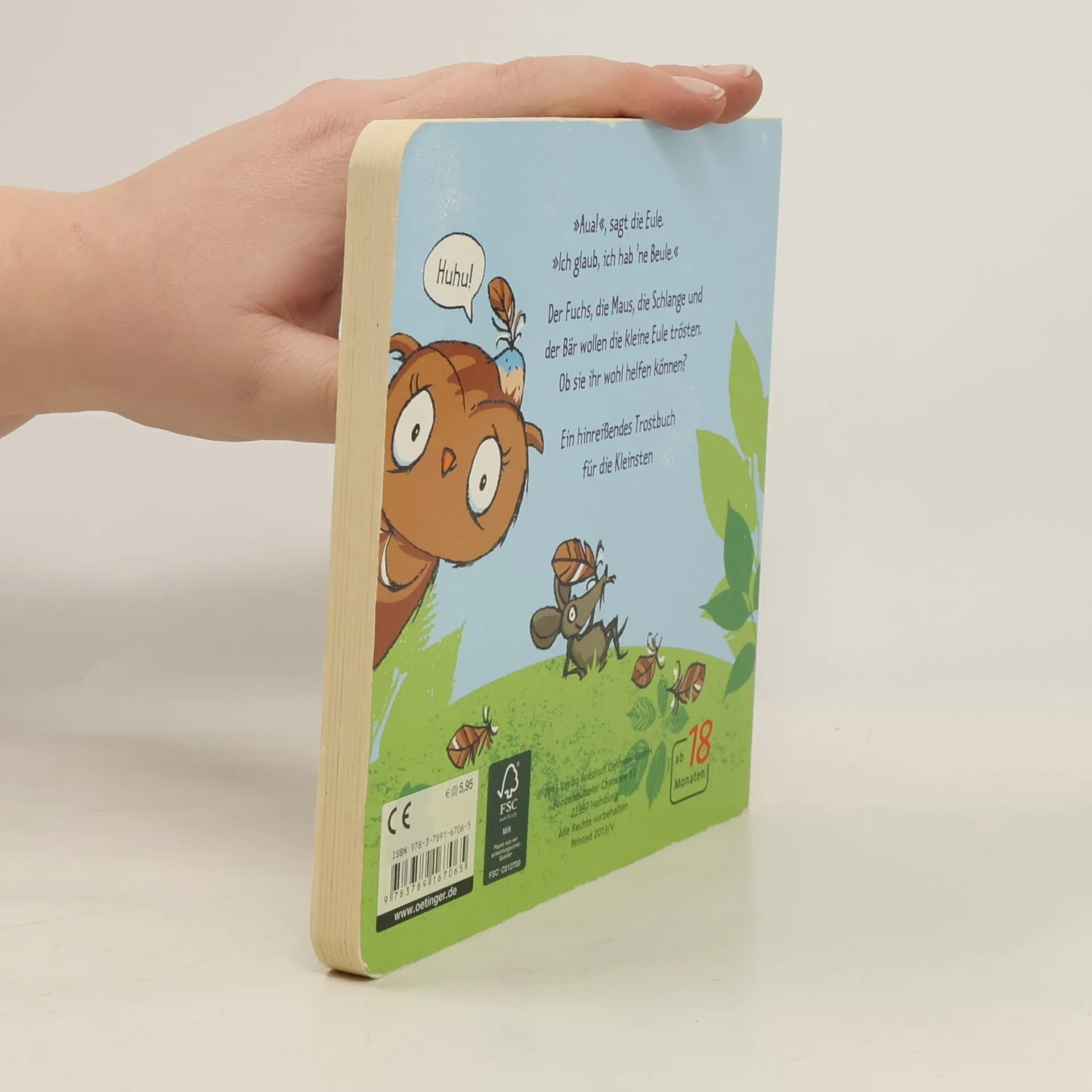 Arme kleine Eule! Ein wunderbares Trostbuch. Die kleine Eule hat eine Beule. Der Fuchs pustet, die Maus bringt ein Pflaster und die Schlange streichelt ihr die Wange. Doch was hilft am besten? Natürlich ein Kuss von der Mama! Ein absolutes Lieblingsbuch für kleine Kinder mit der süßesten Eule der Welt. Einfach zum Liebhaben und Mitfühlen! Klare Bilder und einfache Reime zum Mitsprechen sorgen für viel Spaß beim Lesen.