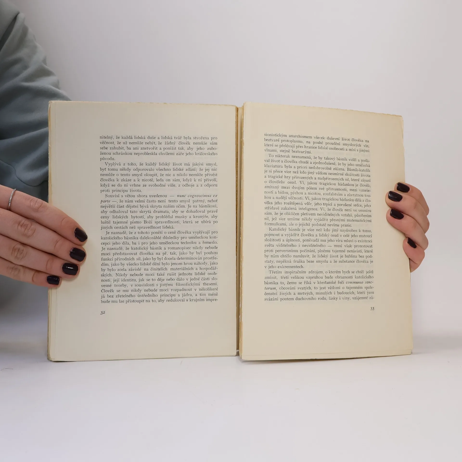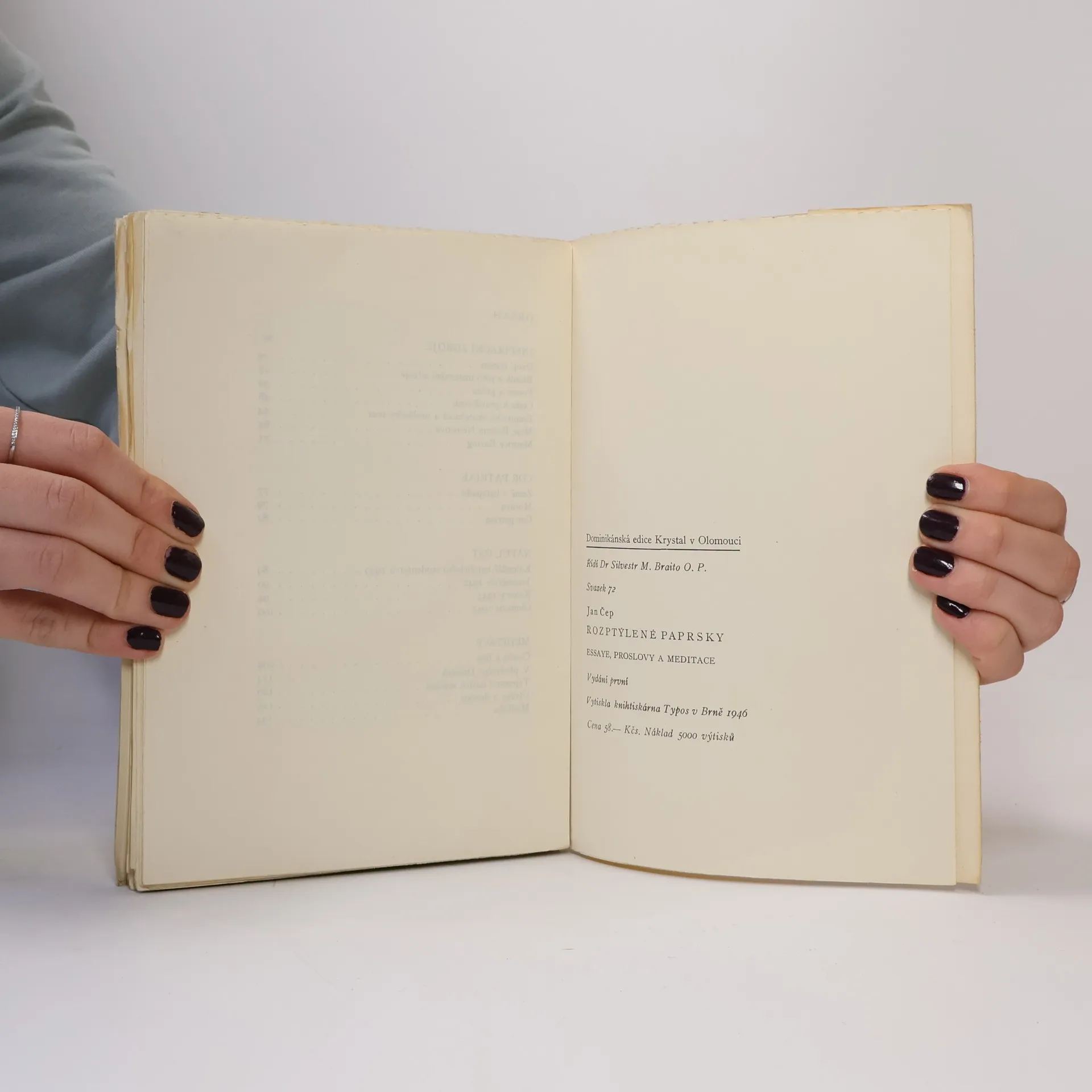 Eseje, proslovy a meditace. Výbor z oblasti esejistiky a žurnalistiky významného katolického spisovatele. Svazek je rozdělen do dvou částí: první zahrnuje jediné vydání esejů, které připravil sám autor a které vydal těsně po válce, druhá část doplňuje tento výbor tak, aby vytvořila obraz autorův doplněný ještě předválečnými a jinými poválečnými pracemi. Všechny příspěvky vznikly do jeho odchodu do emigrace do r. 1948. Většina příspěvků druhé části byla publikována časopisecky a je tedy prakticky dnes nedostupná. Po tomto svazku budou následovat další dva rozsáhlé soubory, shrnující jeho autobiografickou a rozhlasovou tvorbu.
