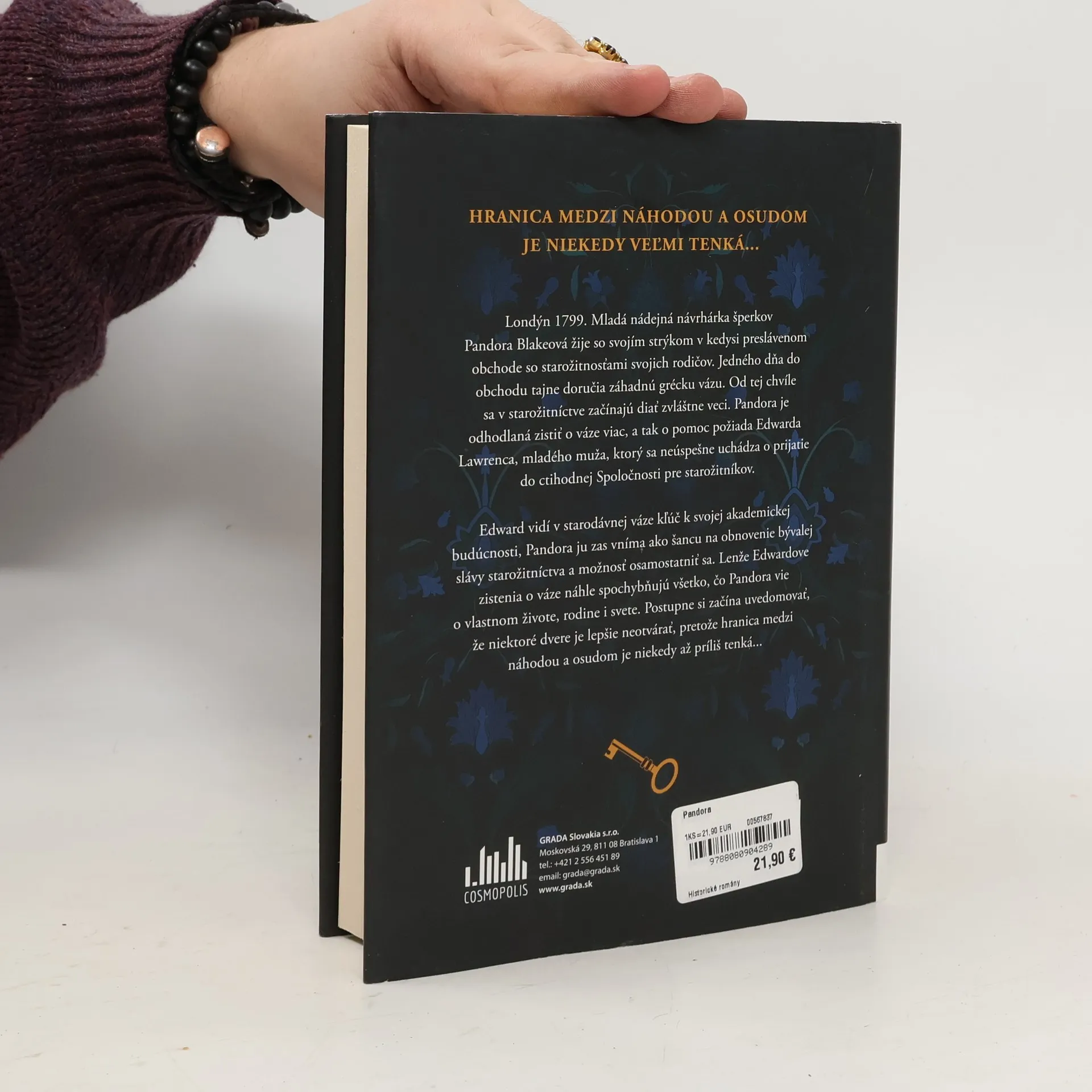 Londýn 1799. Mladá nádejná návrhárka šperkov Pandora Blakeová žije so svojím strýkom v kedysi preslávenom obchode so starožitnosťami svojich rodičov. Jedného dňa do obchodu tajne doručia záhadnú grécku vázu. Od tej chvíle sa v starožitníctve začínajú diať zvláštne veci. Pandora je odhodlaná zistiť o váze viac, a tak o pomoc požiada Edwarda Lawrenca, mladého muža, ktorý sa neúspešne uchádza o prijatie do ctihodnej Spoločnosti pre starožitníkov.Edward vidí v starodávnej váze kľúč k svojej akademickej budúcnosti, Pandora ju zas vníma ako šancu na obnovenie bývalej slávy starožitníctva a možnosť osamostatniť sa. Lenže Edwardove zistenia o váze náhle spochybňujú všetko, čo Pandora vie o vlastnom živote, rodine i svete. Postupne si začína uvedomovať, že niektoré dvere je lepšie neotvárať, pretože hranica medzi náhodou a osudom je niekedy až príliš tenká...