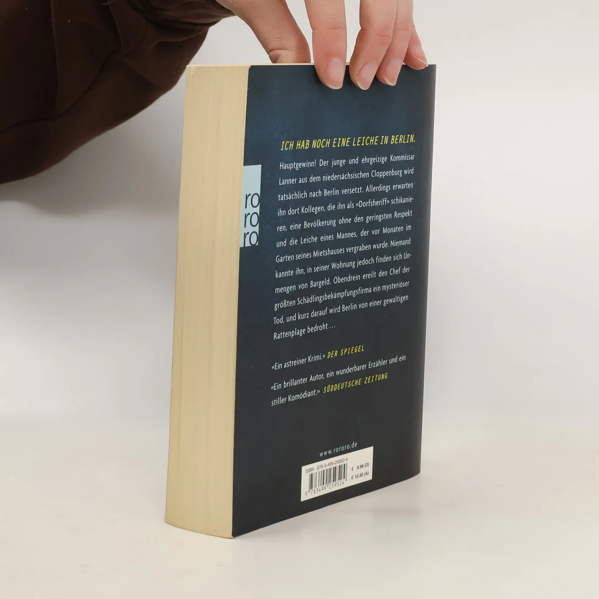 Ich hab noch eine Leiche in Berlin Hauptgewinn! Der junge und ehrgeizige Kommissar Lanner aus dem niedersächsischen Cloppenburg wird tatsächlich nach Berlin versetzt. Allerdings erwarten ihn dort Kollegen, die ihn als «Dorfsheriff» schikanieren, eine Bevölkerung ohne den geringsten Respekt und die Leiche eines Mannes, der vor Monaten im Garten seines Mietshauses vergraben wurde. Niemand kannte ihn, in seiner Wohnung jedoch finden sich Unmengen von Bargeld. Obendrein ereilt den Chef der größten Schädlingsbekämpfungsfirma ein mysteriöser Tod, und kurz darauf wird Berlin von einer gewaltigen Rattenplage bedroht …