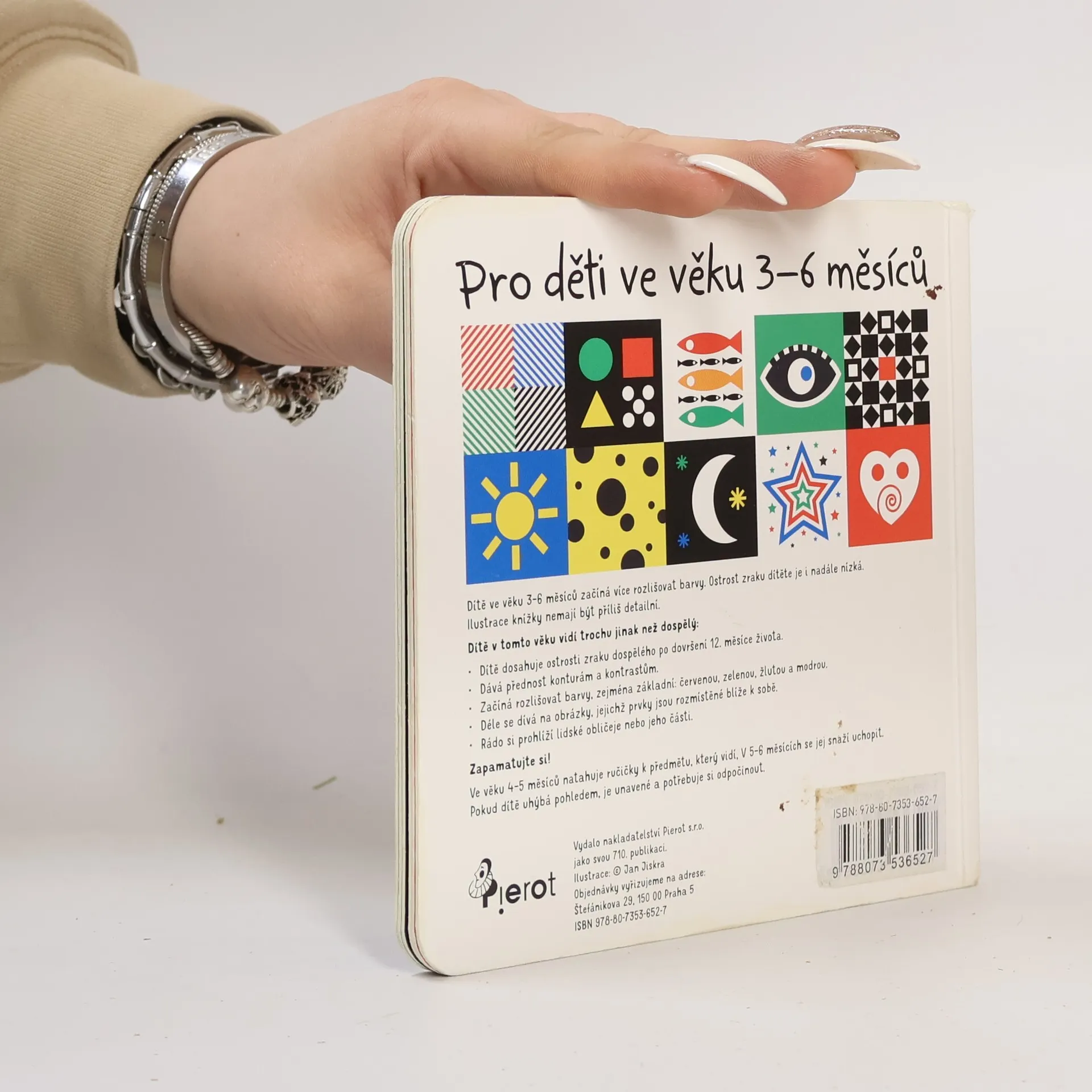 Dítě ve věku 3–6 měsíců začíná více rozlišovat barvy. Ostrost zraku dítěte je i nadále nízká.Ilustrace knížky nemají být příliš detailní. Dítě v tomto věku vidí trochu jinak než dospělý: • Dítě dosahuje ostrosti zraku dospělého po dovršení 12. měsíce života. • Dává přednost konturám a kontrastům. • Začíná rozlišovat barvy, zejména základní: červenou, zelenou, žlutou a modrou. • Déle se dívá na obrázky, jejichž prvky jsou rozmístěné blíže k sobě. • Rádo si prohlíží lidský obličej nebo jeho části. Zapamatujte si! Ve věku 4–5 měsíců natahuje ručičky k předmětu, který vidí, v 5–6 měsících se jej snaží uchopit.Pokud dítě uhýbá pohledem, je unavené a potřebuje si odpočinout