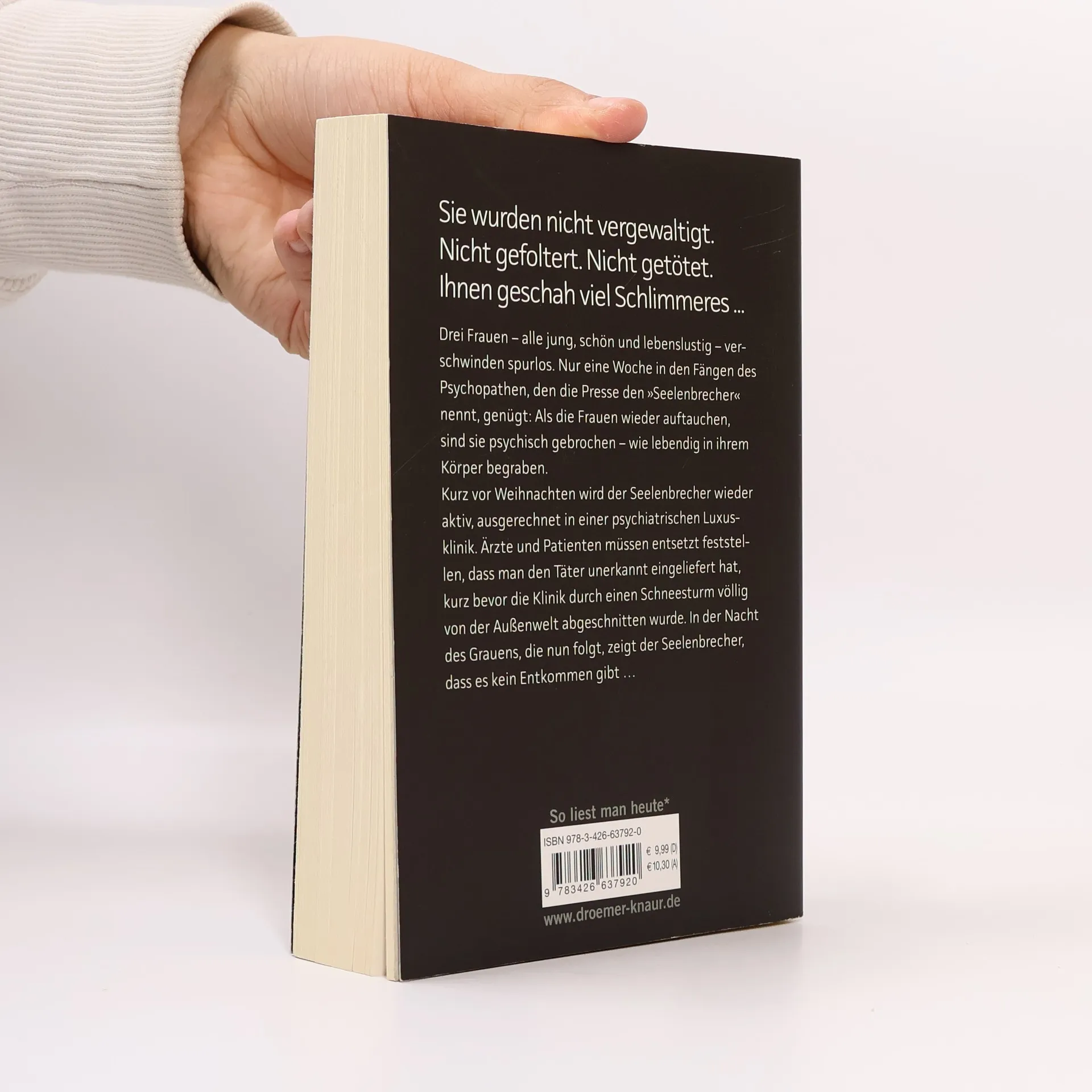 Sebastian Fitzek auf Nervenkitzel-Kurs: Sein bisher härtester Psychothriller! Sie wurden nicht vergewaltigt. Nicht gefoltert. Nicht getötet. Ihnen geschah viel Schlimmeres ... Drei Frauen – alle jung, schön und lebenslustig – verschwinden spurlos. Nur eine Woche in den Fängen des Psychopathen, den die Presse den »Seelenbrecher« nennt, genügt: Als die Frauen wieder auftauchen, sind sie psychisch gebrochen – wie lebendig in ihrem Körper begraben. Kurz vor Weihnachten wird der Seelenbrecher wieder aktiv, ausgerechnet in einer psychiatrischen Luxusklinik. Ärzte und Patienten müssen entsetzt feststellen, dass man den Täter unerkannt eingeliefert hat, kurz bevor die Klinik durch einen Schneesturm völlig von der Außenwelt abgeschnitten wurde. In der Nacht des Grauens, die nun folgt, zeigt der Seelenbrecher, dass es kein Entkommen gibt … Mit psychologischer Raffinesse und atemberaubender Spannung entführt Sebastian Fitzek seine Leser in die dunklen Abgründe der menschlichen Seele.