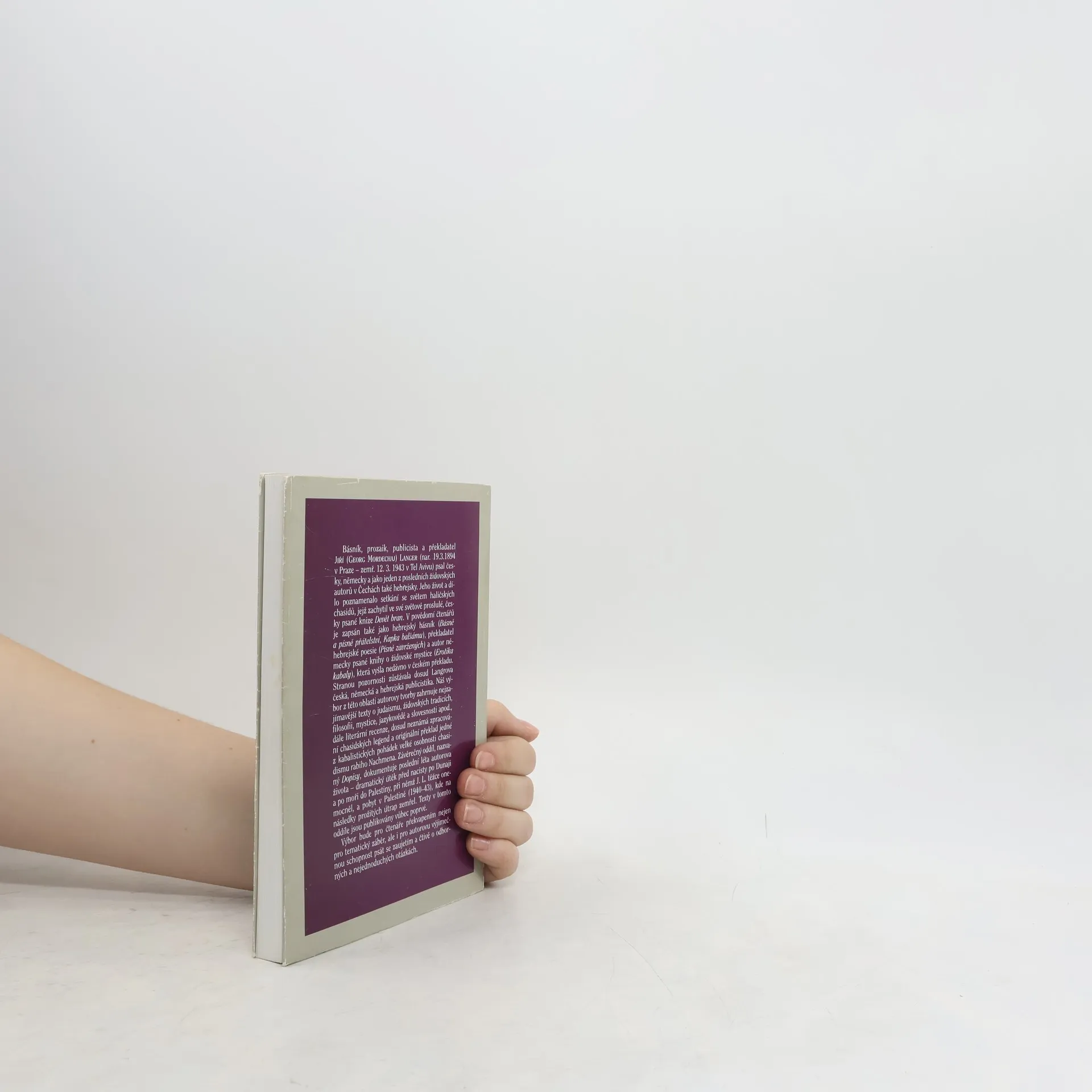 Výbor z Langrovy publicistiky - texty o judaismu, židovských tradicích, filozofii, mystice, jazykovědě a slovesnosti. Závěrečný díl Dopisy dokumentuje autorův dramatický útěk před nacisty do Palestiny a jeho pobyt v zemi, kde na následky prožitých útrap zemřel. Texty vybrala, k vydání připravila a poznámkami opatřila Alice Marxová. Přeloženo z německých a hebrejských originálů.