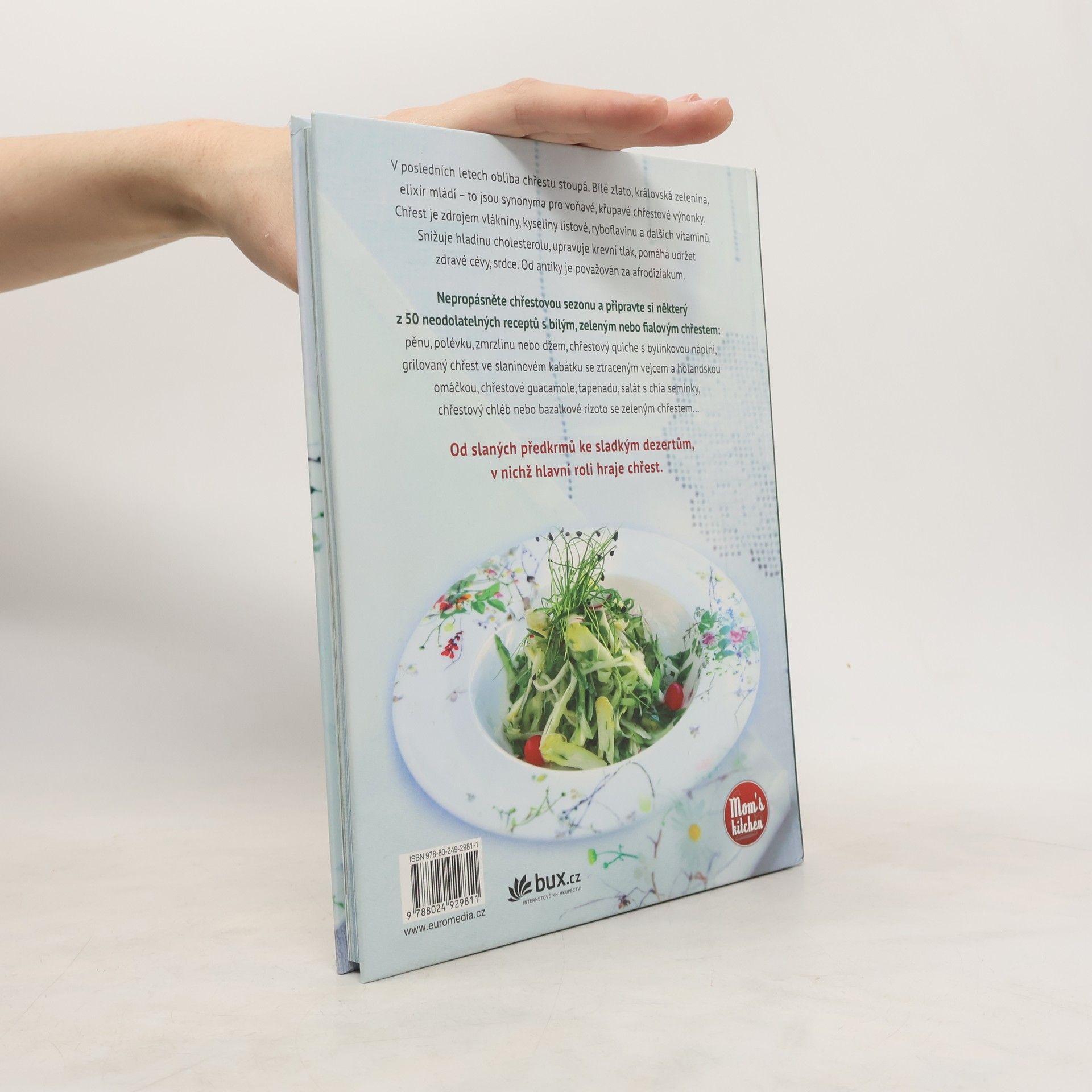 Bílé zlato, královská zelenina, elixír mládí – to jsou synonyma pro voňavé, křupavé chřestové výhonky. Chřest je zdrojem vlákniny, kyseliny listové, ryboflavinu a dalších vitaminů. Snižuje hladinu cholesterolu, upravuje krevní tlak, pomáhá udržet zdravé cévy, srdce. Že znáte jen chřest zapečený se šunkou? Šéfkuchařka vám nabízí 50 neodolatelných receptů na předkrmy, polévky, hlavní jídla, slané koláče, nebo dokonce sladké dezerty. Možná je během krátké chřestové sezony ani nestačíte vyzkoušet.