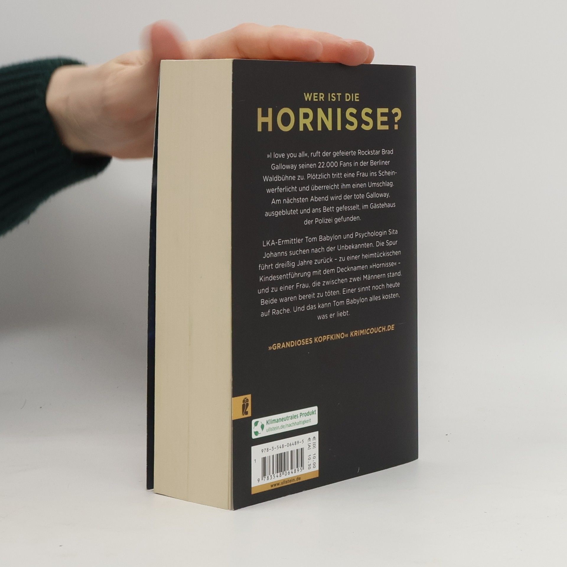 Wer ist die Hornisse? »I love you all«, ruft der gefeierte Rockstar Brad Galloway seinen 22.000 Fans in der Berliner Waldbühne zu. Plötzlich tritt eine Frau ins Scheinwerferlicht und überreicht ihm einen Umschlag. Am nächsten Abend wird der tote Galloway, ausgeblutet und ans Bett gefesselt, im Gästehaus der Polizei gefunden. LKA-Ermittler Tom Babylon sucht gemeinsam mit der Psychologin Sita Johanns nach der Unbekannten. Die Spur führt dreißig Jahre zurück – zu einer heimtückischen Kindesentführung mit dem Decknamen »Hornisse« – und zu einer Frau, die zwischen zwei Männern stand. Beide waren bereit zu töten. Einer sinnt noch heute auf Rache. Und das kann Tom Babylon alles kosten, was er liebt. „Grandioses Kopfkino“ - KRIMIcouch. de