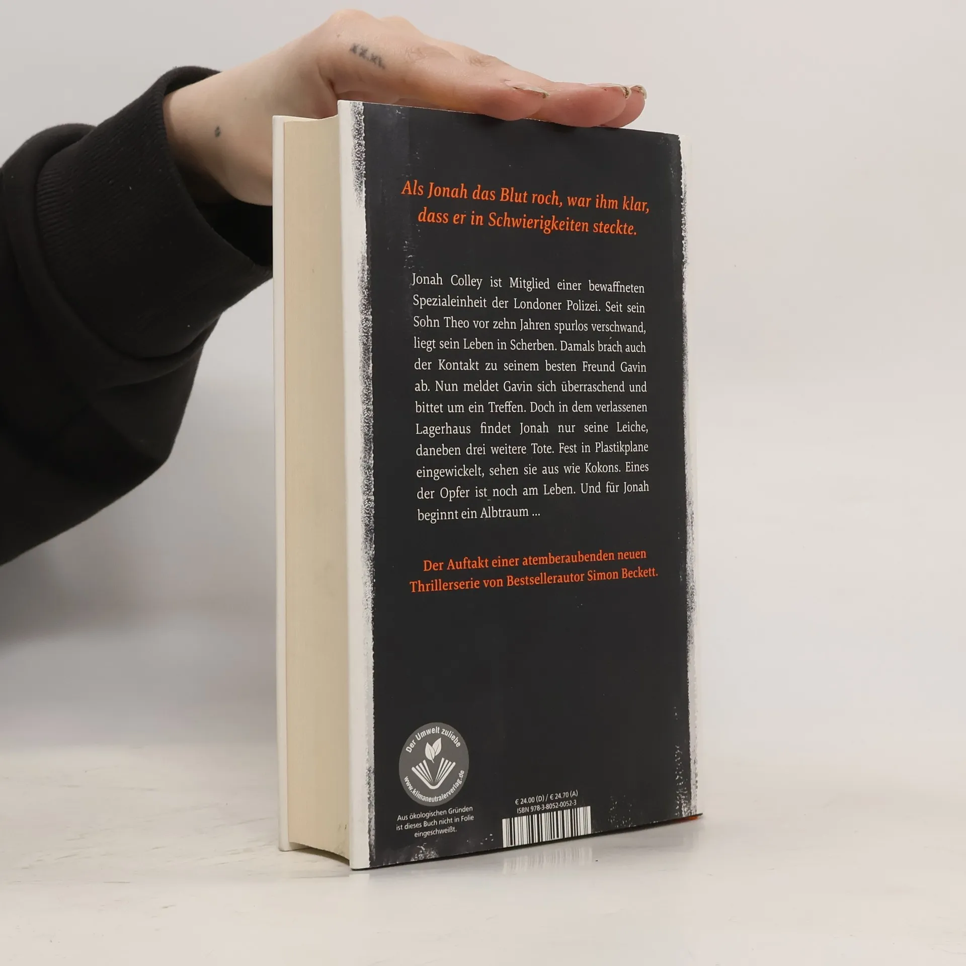 Als Jonah das Blut roch, war ihm klar, dass er in Schwierigkeiten steckte. Jonah Colley ist Mitglied einer bewaffneten Spezialeinheit der Londoner Polizei. Seit sein Sohn Theo vor zehn Jahren spurlos verschwand, liegt sein Leben in Scherben. Damals brach auch der Kontakt zu seinem besten Freund Gavin ab. Nun meldet Gavin sich überraschend und bittet um ein Treffen. Doch in dem verlassenen Lagerhaus findet Jonah nur seine Leiche, daneben drei weitere Tote. Fest in Plastikplane eingewickelt, sehen sie aus wie Kokons. Eines der Opfer ist noch am Leben. Und für Jonah beginnt ein Albtraum… Der Auftakt einer atemberaubenden neuen Thrillerserie von Bestsellerautor Simon Beckett.