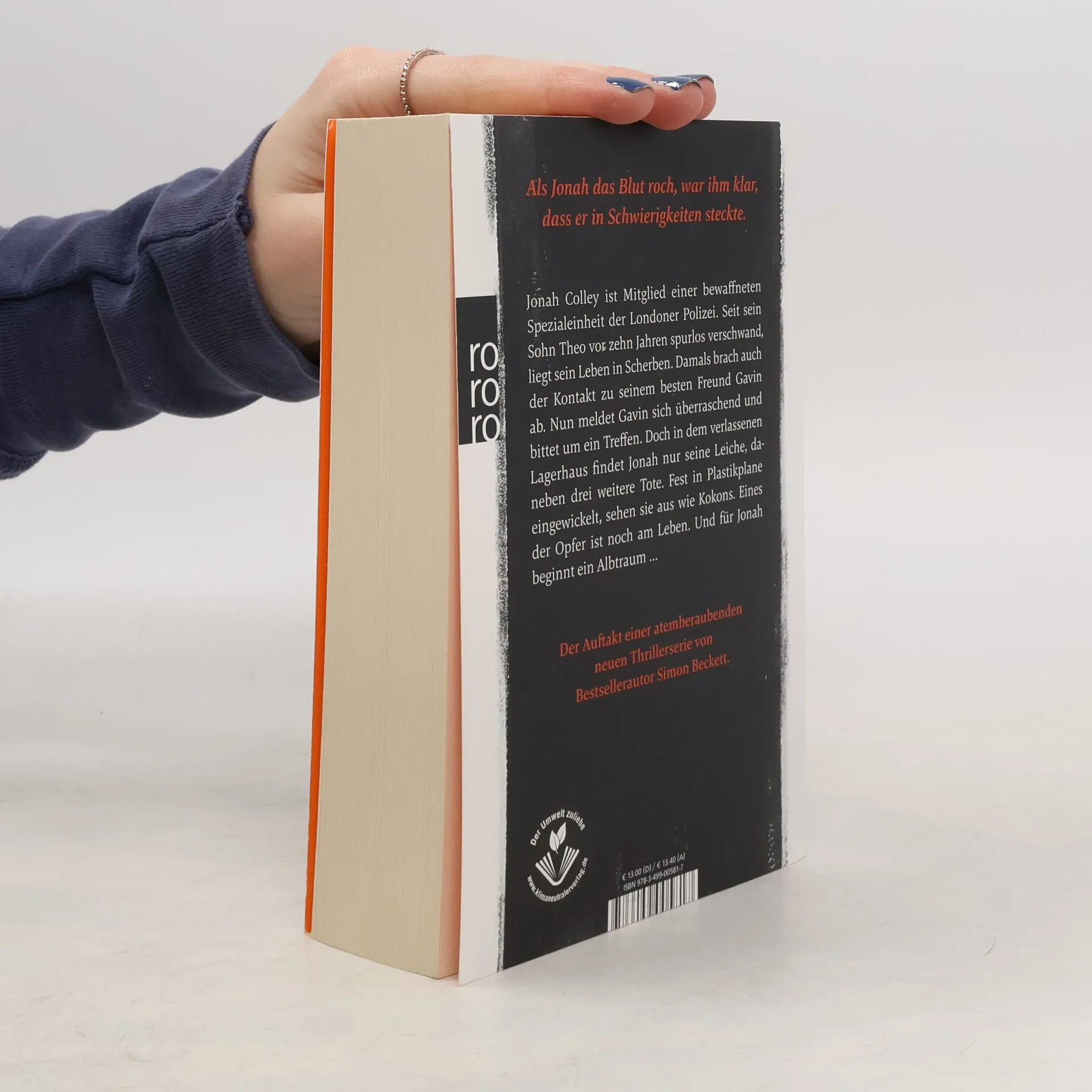 Als Jonah das Blut roch, war ihm klar, dass er in Schwierigkeiten steckte. Jonah Colley ist Mitglied einer bewaffneten Spezialeinheit der Londoner Polizei. Seit sein Sohn Theo vor zehn Jahren spurlos verschwand, liegt sein Leben in Scherben. Damals brach auch der Kontakt zu seinem besten Freund Gavin ab. Nun meldet Gavin sich überraschend und bittet um ein Treffen. Doch in dem verlassenen Lagerhaus findet Jonah nur seine Leiche, daneben drei weitere Tote. Fest in Plastikplane eingewickelt, sehen sie aus wie Kokons. Eines der Opfer ist noch am Leben. Und für Jonah beginnt ein Albtraum … Der Auftakt einer atemberaubenden neuen Thrillerserie von Bestsellerautor Simon Beckett.