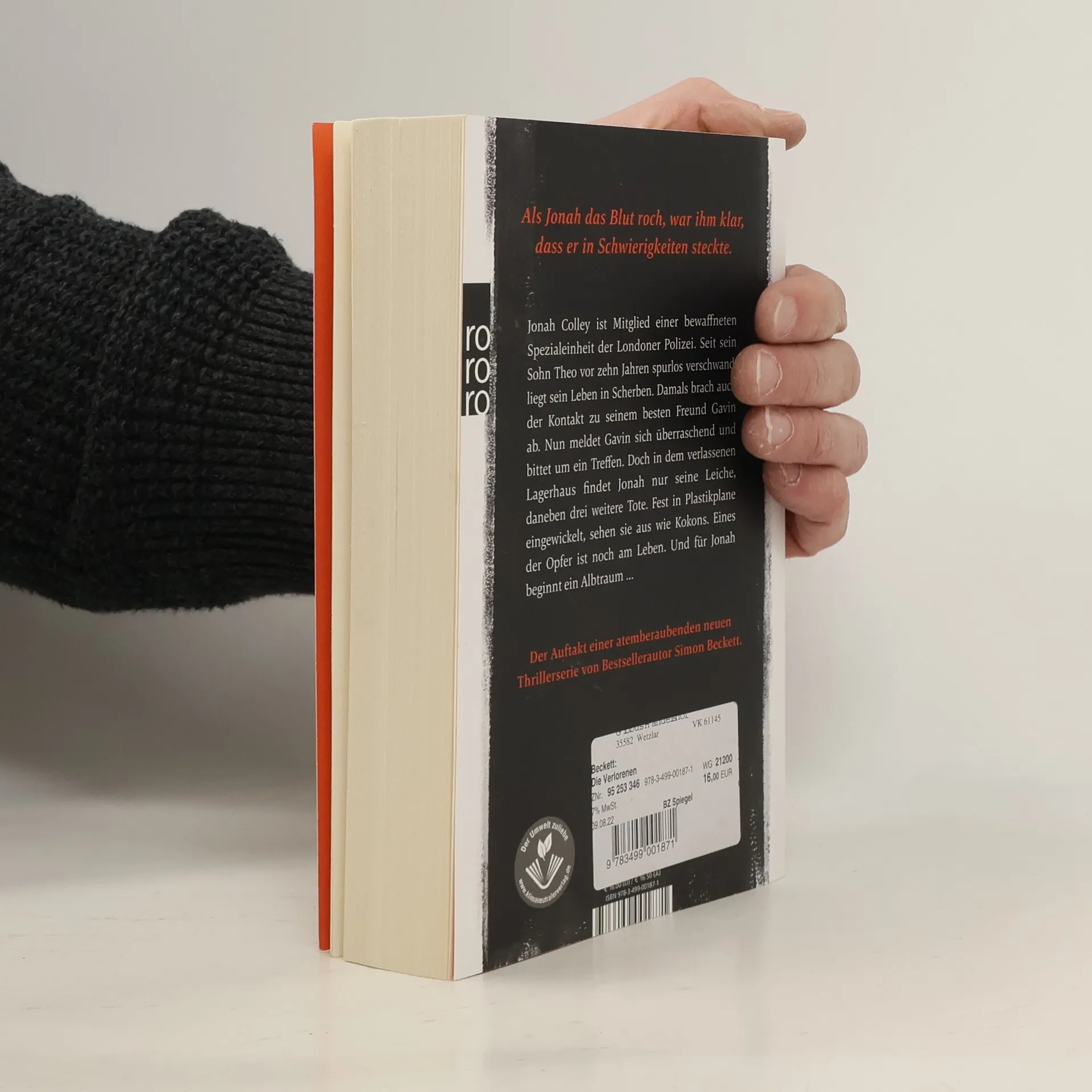 Als Jonah das Blut roch, war ihm klar, dass er in Schwierigkeiten steckte. Jonah Colley ist Mitglied einer bewaffneten Spezialeinheit der Londoner Polizei. Seit sein Sohn Theo vor zehn Jahren spurlos verschwand, liegt sein Leben in Scherben. Damals brach auch der Kontakt zu seinem besten Freund Gavin ab. Nun meldet Gavin sich überraschend und bittet um ein Treffen. Doch in dem verlassenen Lagerhaus findet Jonah nur seine Leiche, daneben drei weitere Tote. Fest in Plastikplane eingewickelt, sehen sie aus wie Kokons. Eines der Opfer ist noch am Leben. Und für Jonah beginnt ein Albtraum … Der Auftakt einer atemberaubenden neuen Thrillerserie von Bestsellerautor Simon Beckett.