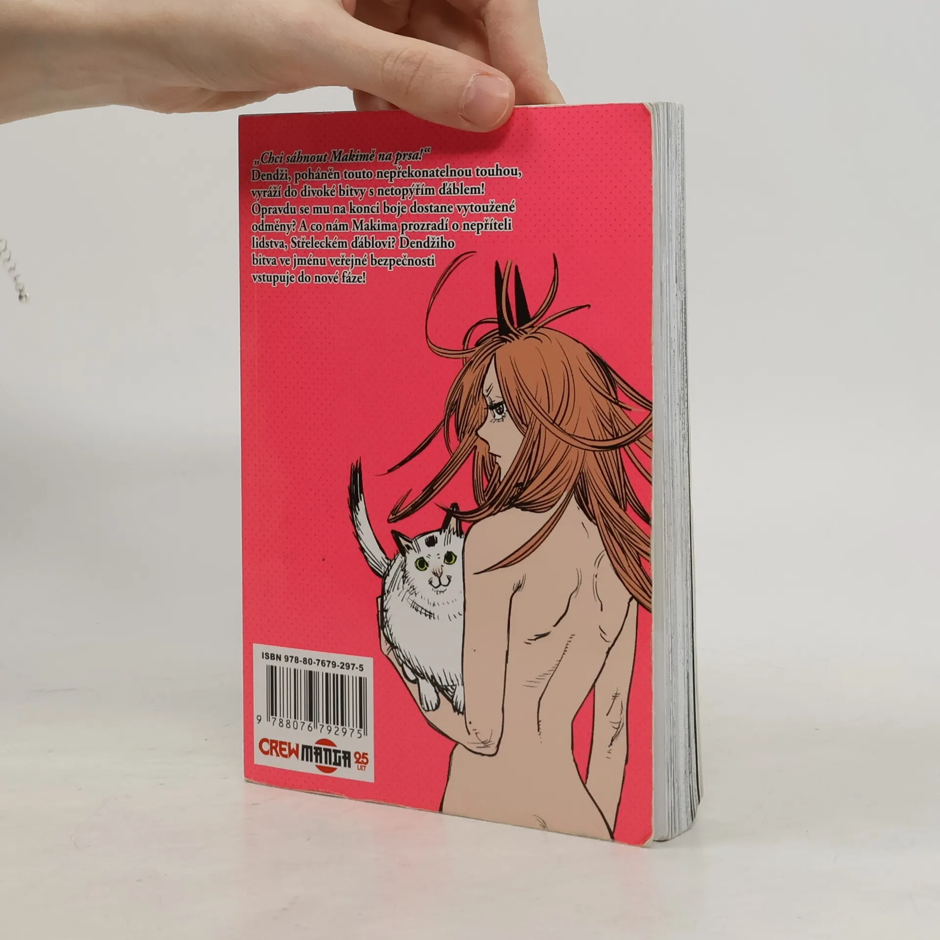 „Chci šáhnout Makimě na prsa!“Dendži, poháněn touto nepřekonatelnou touhou, vyráží do divoké bitvy s netopýřím ďáblem! Dostane se mu na konci boje opravdu vytoužené odměny? A co nám Makima prozradí o nepříteli lidstva, Střeleckém ďáblovi? Dendžiho bitva ve jménu veřejné bezpečnosti vstupuje do nové fáze!