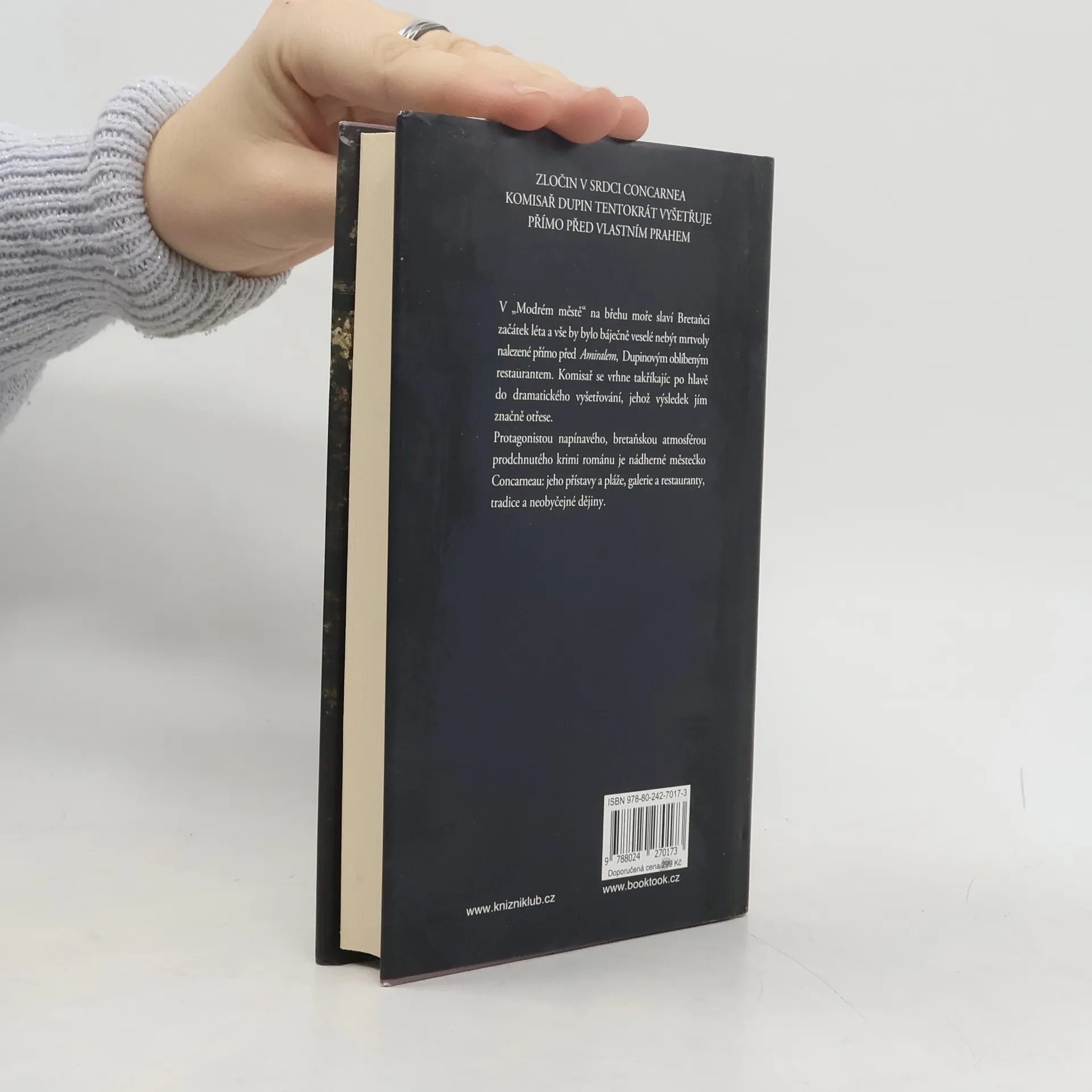 Osmý případ pro komisaře Dupina, milovníka tučňáků a kofeinu, rodilého Pařížana za trest přeloženého do Bretaně – na konec světa. KOMISAŘ DUPIN TENTOKRÁT VYŠETŘUJE PŘÍMO PŘED VLASTNÍM PRAHEM V „Modrém městě“ na břehu moře slaví Bretaňci začátek léta a vše by bylo báječně veselé nebýt mrtvoly nalezené přímo před Amiralem, Dupinovým oblíbeným restaurantem. Komisař se vrhne takříkajíc po hlavě do dramatického vyšetřování, jehož výsledek jím značně otřese. Protagonistou napínavého, bretaňskou atmosférou prodchnutého krimi románu je nádherné městečko Concarneau: jeho přístavy a pláže, galerie a restauranty, tradice a neobyčejné dějiny.