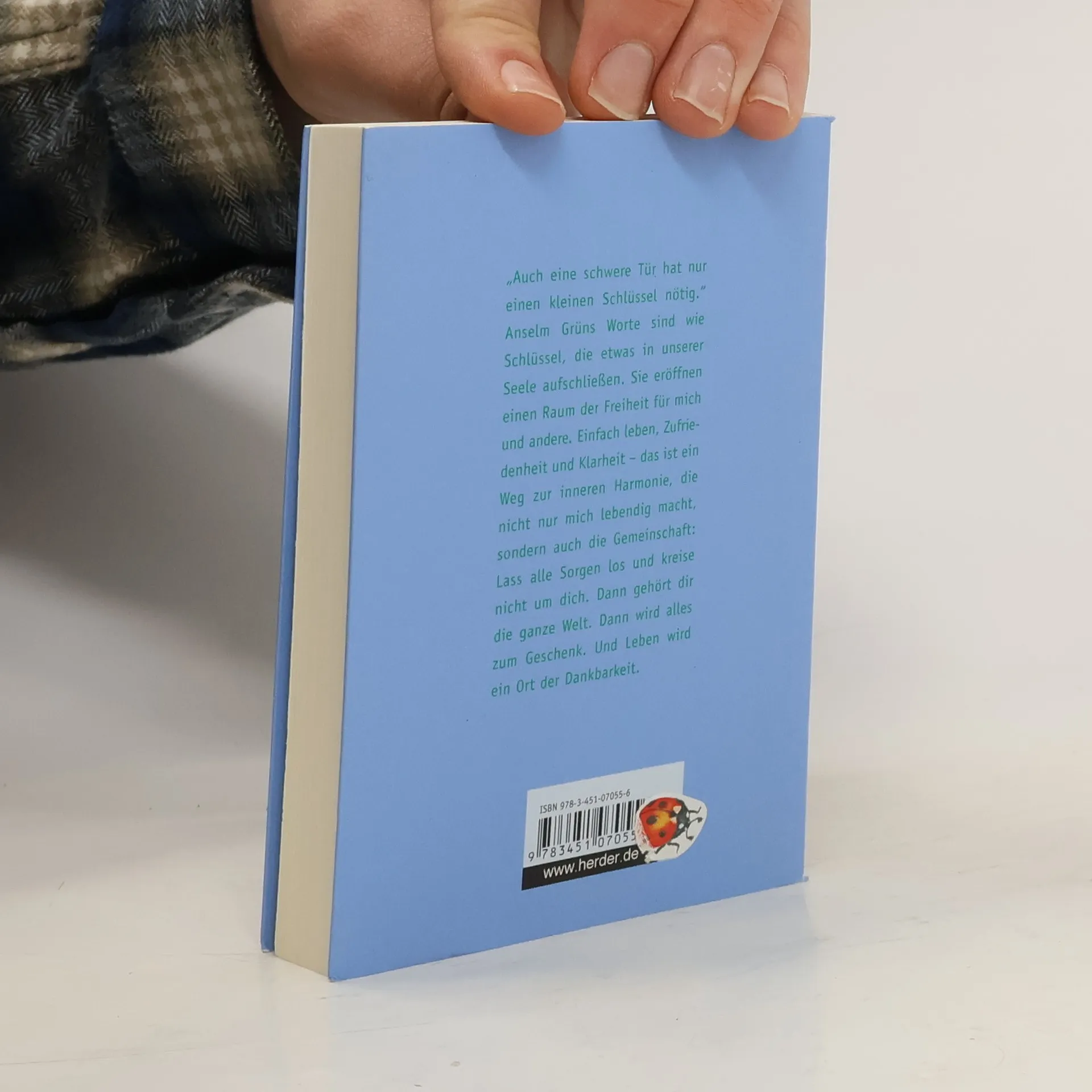 „Auch eine schwere Tür hat nur einen kleinen Schlüssel nötig.“ Anselm Grüns Worte sind wie Schlüssel, die etwas in unserer Seele aufschließen. Sie eröffnen einen Raum der Freiheit für mich und andere. Einfach leben, Zufriedenheit und Klarheit - das ist ein Weg zur inneren Harmonie, die nicht nur mich lebendig macht, sondern auch die Gemeinschaft. Lass alle Sorgen los und kreise nicht um dich. Dann gehört dir die ganze Welt. Dann wird alles zum Geschenk. Und Leben wird ein Ort der Dankbarkeit.