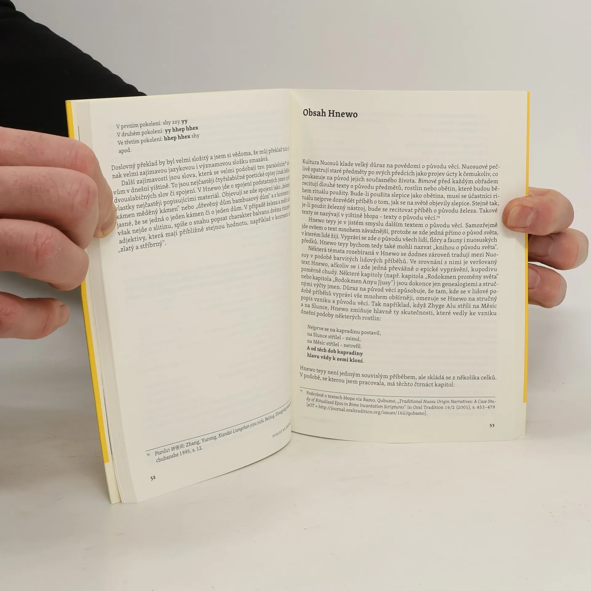 Podtitul: Posvátná kniha Nuosuů Nuosuové žijí v jižním Sichuanu, jedné z největších čínských provincii. Mají vlastní jazyk, písmo, kulturu i náboženství. Hnewo teyy je jejich mytologický epos, zápis o vzniku světa, rituální text, historie Nuosuů a průvodce po Chladných horách. Chladné hory – to je prostor pro pěstování plodin, pastvu dobytka, pro hry i válčení. Místo, kde duše předků pobývají společně s živými. Šamani a šamanky v extázi tančí a kněží bimové nad obětinami recitují zaklínací formule a vypočítávají příhodné dny podle konstelací hvězd. Ideální domov pro Nuosuy, pro dívky v dlouhých sukních a kazajkách v barvách ohně, chlapce v turbanech a širokých kalhotách, babičky v tmavě modrém s černými pokrývkami hlavy a bimy s kouzelnickými klobouky. Černá je barva úšlechtilosti, úcty, vysokého postavení. Černá je nejvyšší kasta.