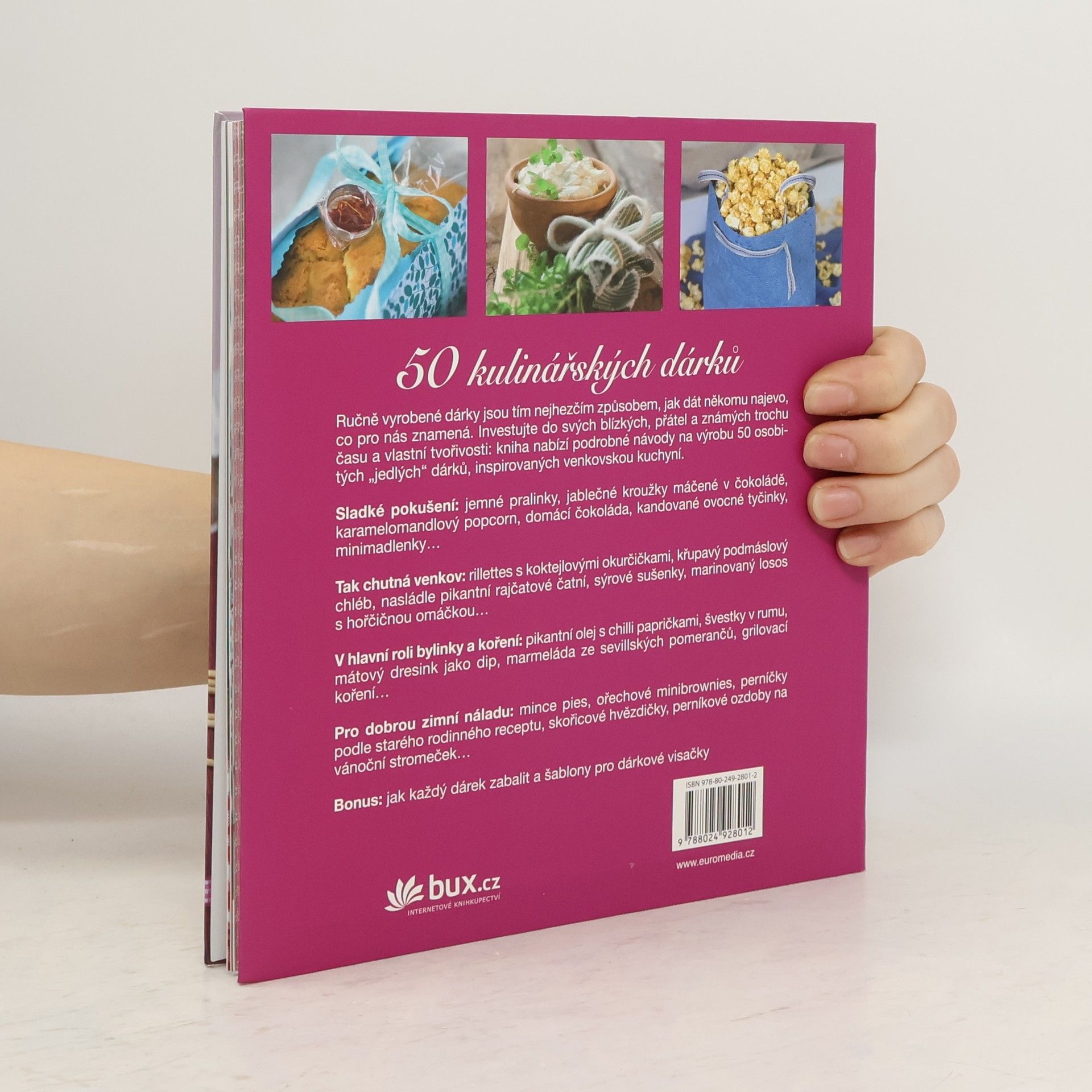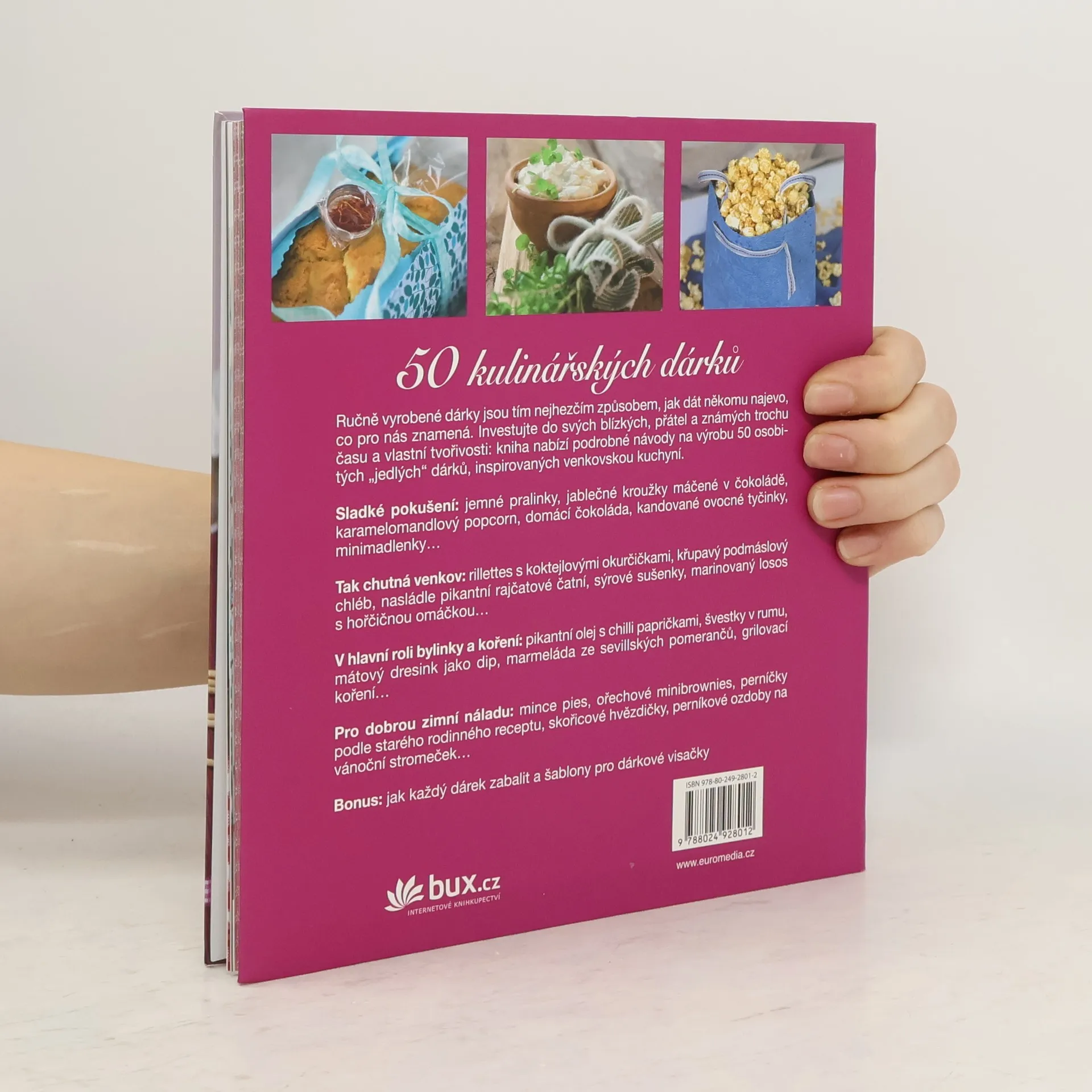 Originální jedlé dárky - Sladké a pikantní ve venkovském stylu Uvařit, upéct, ozdobit a vymyslet originální obal, to vše svědčí o pozornosti, kterou věnujeme ručně vyráběným dárkům. V knize najdete na padesát receptů. S vlastními domácími pralinkami, kandovanými citrusy, ořechovým chlebem v květináči, grilovacím kořením, ručně připraveným sýrem, mramorovanými vejci na řeřichovém lůžku nebo čočkovou polévkou, darovanou v kouzelném retro kastrůlku, darujete také radost a požitek. A možná i téma k hovoru. Vždyť nejhezčí dárek je ten, na který bude obdarovaný ještě dlouho vzpomínat.