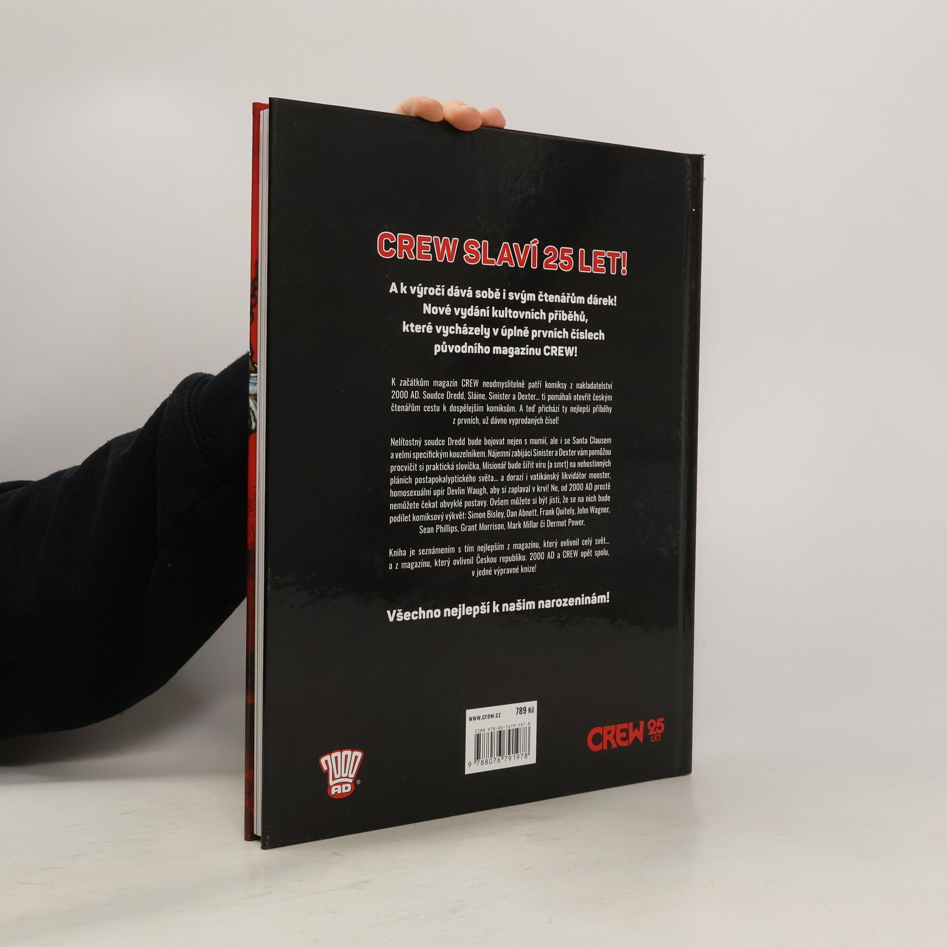 CREW SLAVÍ 25 LET! A k tomu dává sobě i svým čtenářům dárek! Nové vydání kultovních příběhů, které vycházely v úplně prvních číslech původního magazínu CREW! K začátkům magazín CREW neodmyslitelně patří komiksy z 2000 AD. Soudce Dredd, Sláine, Sinister a Dexter… ti pomáhali otevřít českým čtenářům cestu k dospělejším komiksům. A teď přichází ty nejlepší příběhy z prvních, už dávno vyprodaných čísel! Nelítostný soudce Dredd bude bojovat nejen s mumií, ale i se Santa Clausem a velmi specifickým kouzelníkem. Nájemní zabijáci Sinister a Dexter vám pomůžou procvičit si nutná slovíčka, Misionář bude šířit víru (a smrt) na nehostinných pláních postapokalyptického světa… a dorazí i vatikánský likvidátor monster Devlin Waugh, aby si zaplaval v krvi! Ne, od 2000 AD prostě nemůžete čekat obvyklé postavy. Ovšem zato můžete čekat, že se na nich bude podílet komiksový výkvět: Simon Bisley, Dan Abnett, Frank Quitely, John Wagner, Sean Phillips, Grant Morrison, Mark Millar či Dermot Power. Kniha je seznámením s tím nejlepším z magazínu, který ovlivnil celý svět… a z magazínu, který ovlivnil Českou republiku. 2000 AD a CREW opět spolu, v jedné výpravné knize! Všechno nejlepší k našim narozeninám!