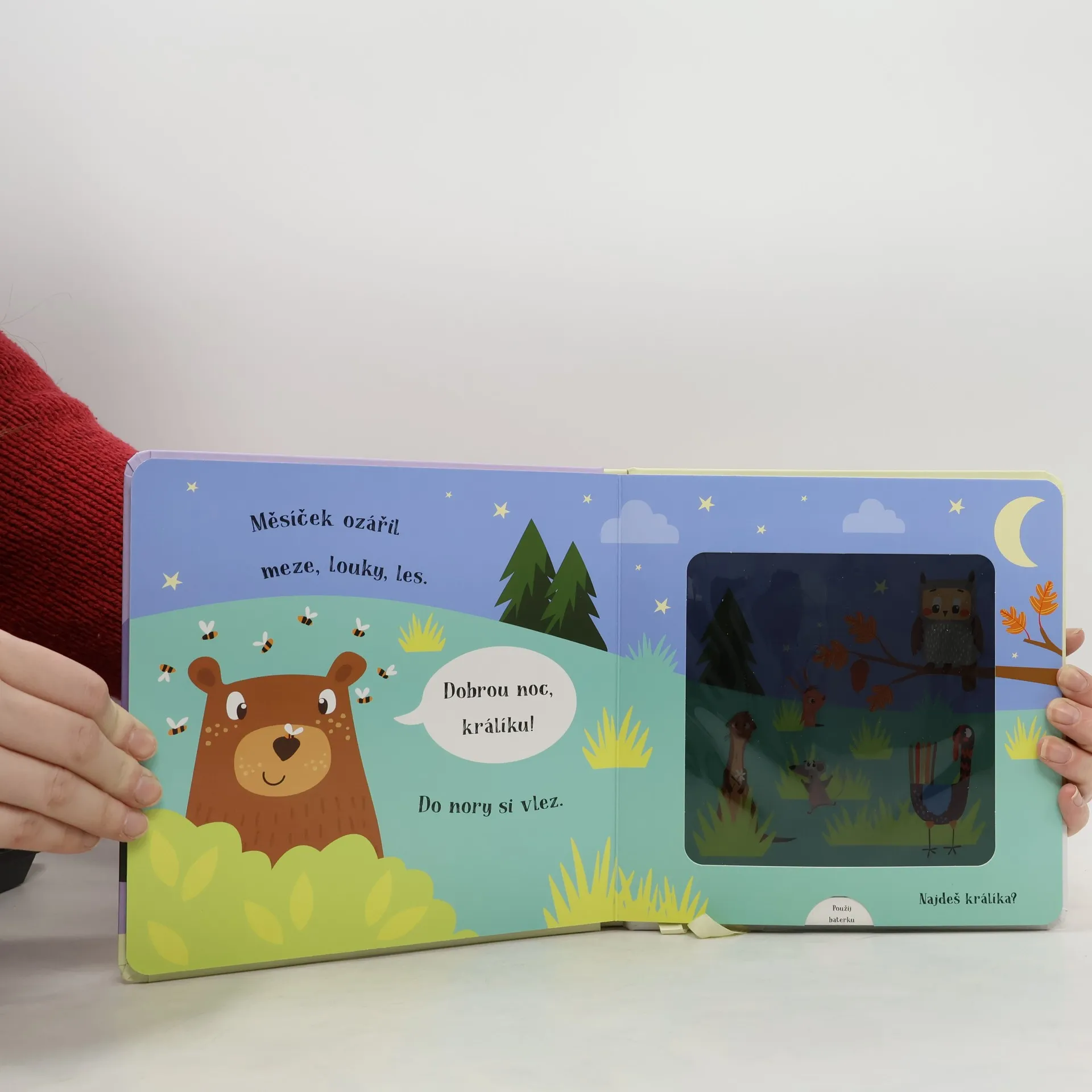 Kouzelné čtení na dobrou noc pro děti. Medvěd už se chystá spát, ale nejprve musí dát dobrou noc všem svým zvířecím kamarádům. Pomůžeš mu je najít? Vsuň kouzelnou baterku mezi stránky a zjisti, kdo se ukrývá v každé ilustraci, zobrazující noc. Text ve verších učí děti vnímat přirozený rytmus řeči. Chytře vyrobená okénka umožňují dětem hledat schovaná zvířátka pomocí přiložené kartonové pomůcky ve tvaru svítilny. Nabídněte svému dítěti před spaním nějakou zklidňující aktivitu. Tato knížka je pro to přímo stvořená.
