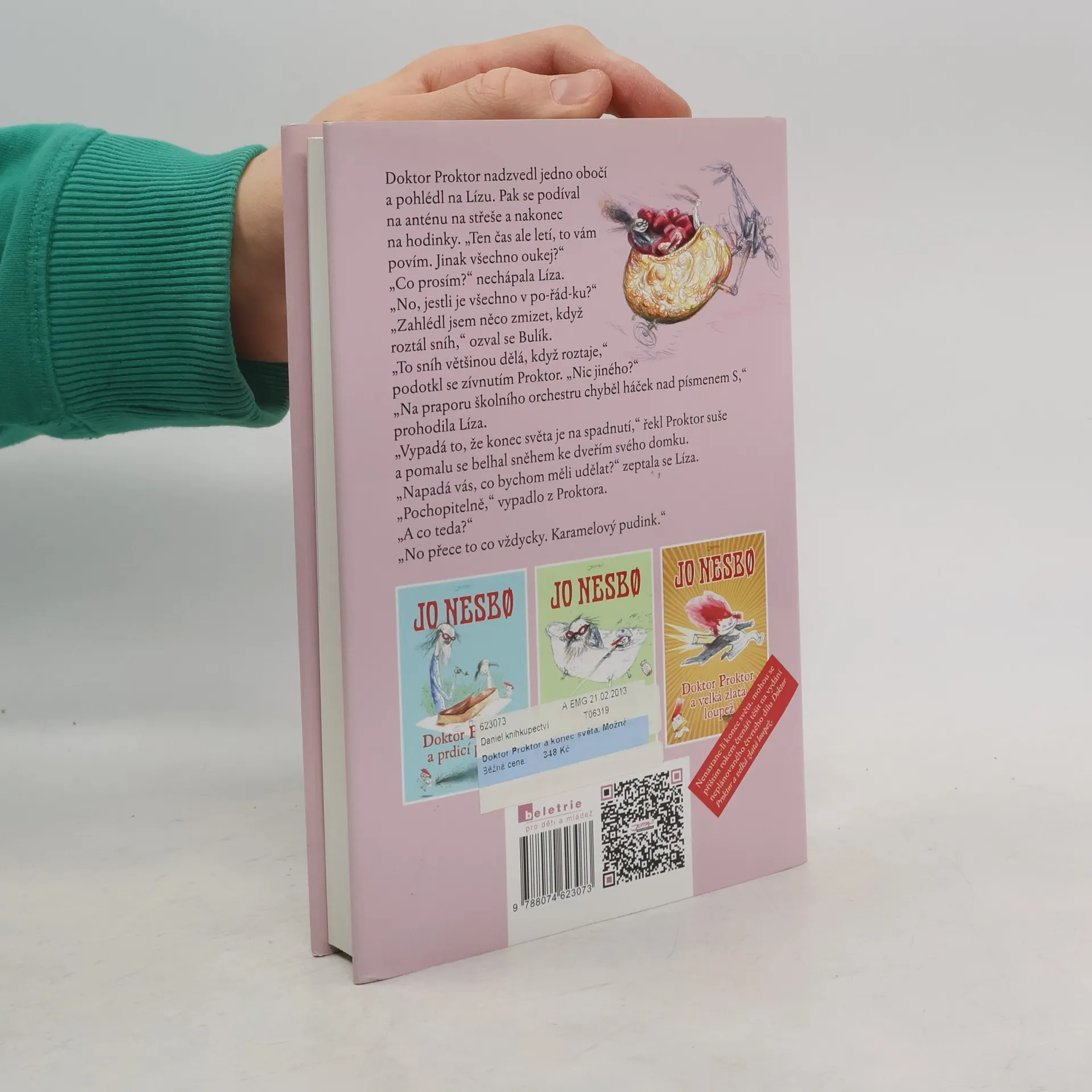 Zábavné a napínavé pokračování o doktoru Proktorovi. Další kolotoč šílených událostí se roztáčí! Doktor Proktor a konec světa. Možná… je název předposledního dílu ze série knih o šíleném, nebo aspoň skoro šíleném, profesoru Proktorovi a jeho stejně smýšlejících spoluhrdinech. Už jste slyšeli, že konec světa je na spadnutí? A že budeme patrně čelit ohromné invazi z vesmíru? Pokud si chcete všechny ty více či méně pravděpodobné předpovědi ujasnit a hodláte v dohledné době přečíst jen jednu knihu o konci světa, sedminohých peruánských pavoucích, a samozřejmě o Bulíkovi, Líze a doktoru Proktorovi, pak jste tu správně. Přečtěte si ji. Možná… Dětská (zatím...) trilogie s doktorem Proktorem v hlavní roli je ověnčena řadou významných ocenění a slaví úspěchy po celém světě. Práva na vydání zakoupilo rekordních 30 zemí!