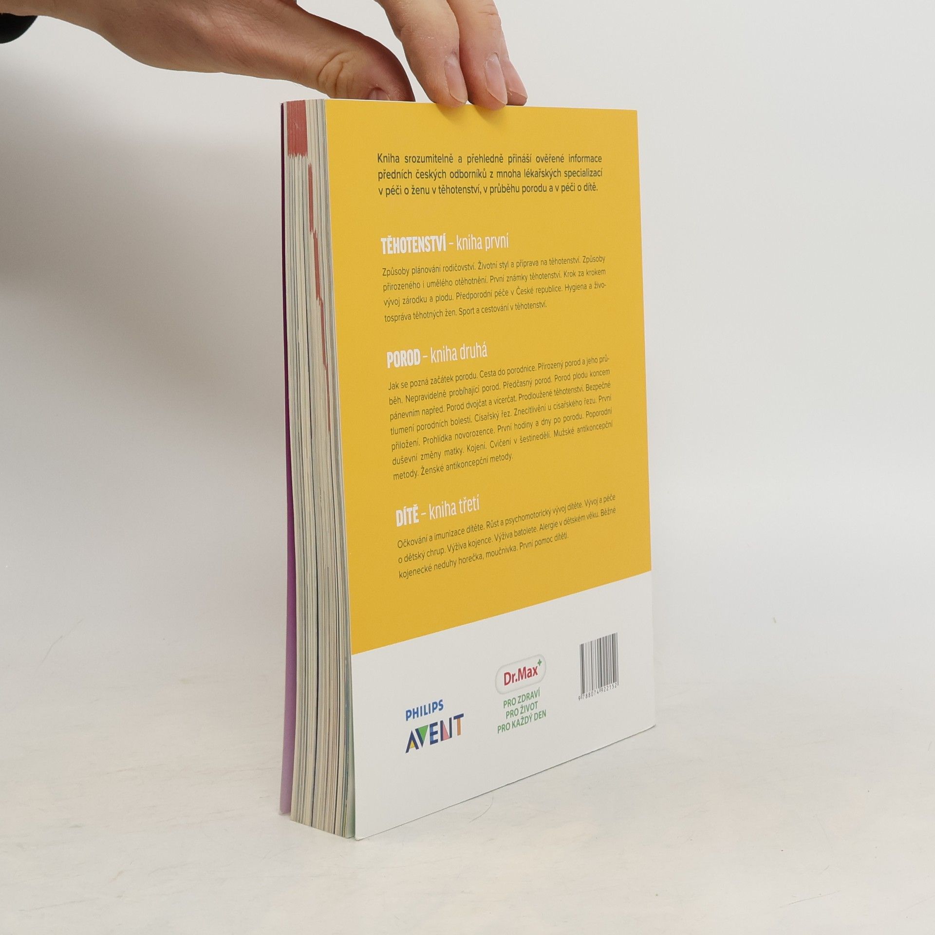 Kniha srozumitelně a přehledně přináší ověřené informace předních českých odborníků z mnoha lékařských oborů o těhotenství, porodu a péči o dítě. Jak se pozná začátek porodu. Cesta do porodnice. Porod přirozený. Průběh porodu. Nepravidelně probíhající porod. Předčasný porod. Porod plodu koncem pánevním napřed. Porod dvojčat a vícerčat. Prodloužené těhotenství. Bezpečné tlumení porodních bolestí. Císařský řez. Znecitlivění u císařského řezu. Prohlídka novorozence. První hodiny a dny po porodu. Poporodní duševní změny matky. Kojení. Cvičení v šestinedělí. Mužské antikoncepční metody. Ženské antikoncepční metody.