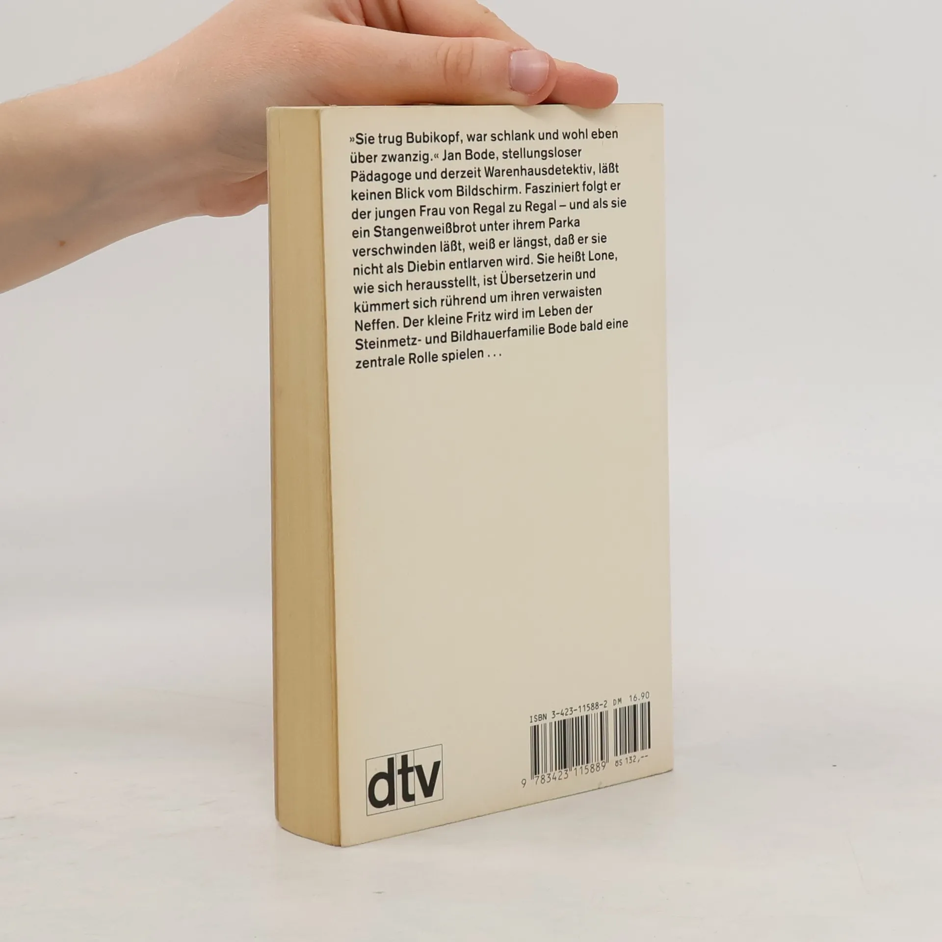 Eine heitere und nachdenkliche Familiengeschichte »Sie trug Bubikopf, war schlank und wohl eben über zwanzig.« Jan Bode, stellungsloser Pädagoge und derzeit Warenhausdetektiv, läßt keinen Blick vom Bildschirm. Fasziniert folgt er der jungen Frau von Regal zu Regal – und als sie ein Stangenweißbrot unter ihrem Parka verschwinden läßt, weiß er längst, daß er sie nicht als Diebin entlarven wird. Sie heißt Lone, wie sich herausstellt, ist Übersetzerin und kümmert sich rührend um ihren verwaisten Neffen. Der kleine Fritz wird im Leben der Steinmetz- und Bildhauerfamilie Bode bald eine zentrale Rolle spielen.