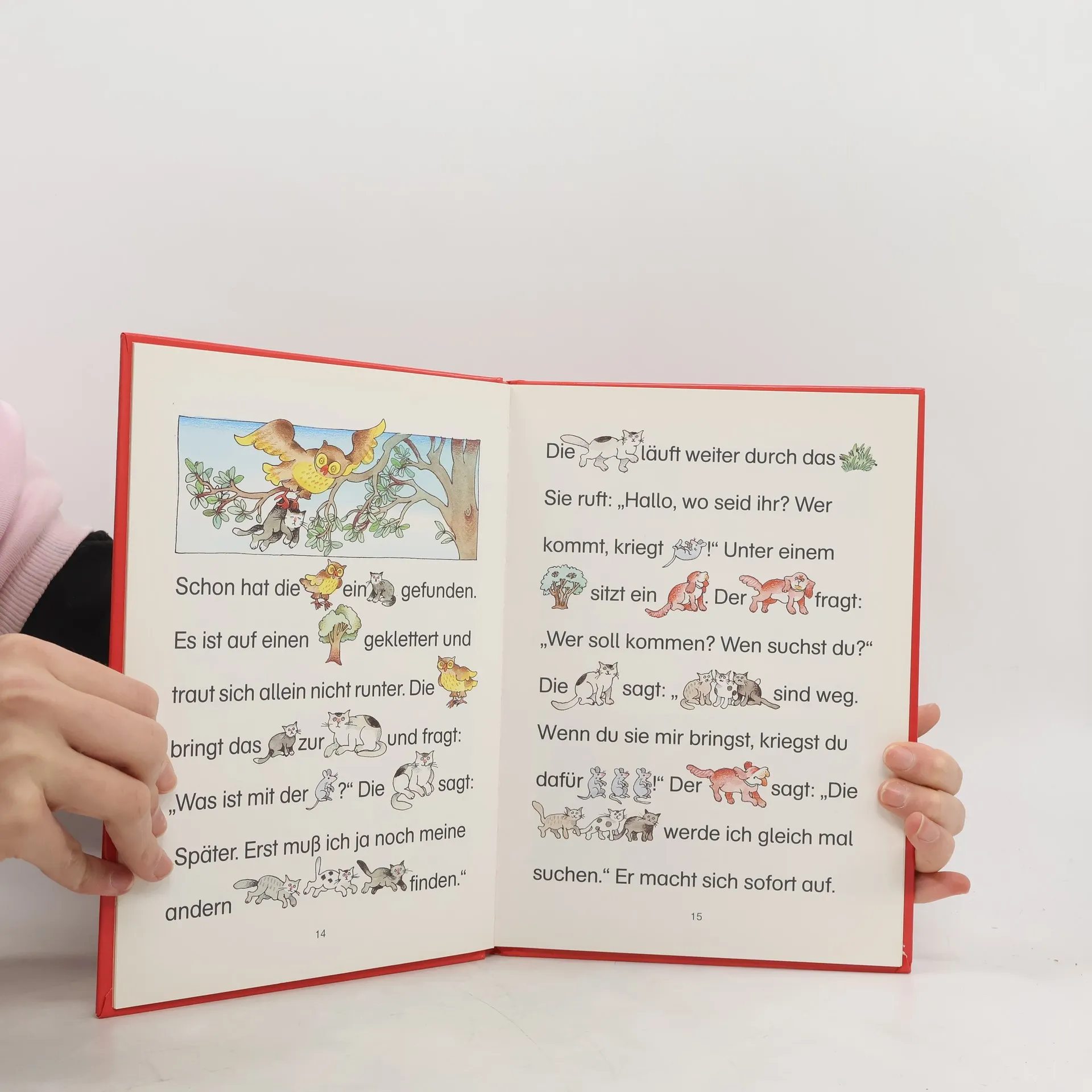 Von einer Katzenmutter und ihren Jungen, von Mäusen, Eule und Hund; eine turbulente Geschichte, in der die Hauptwörter durch Bilder ersetzt sind, so dass auch kleine Kinder mitlesen können.