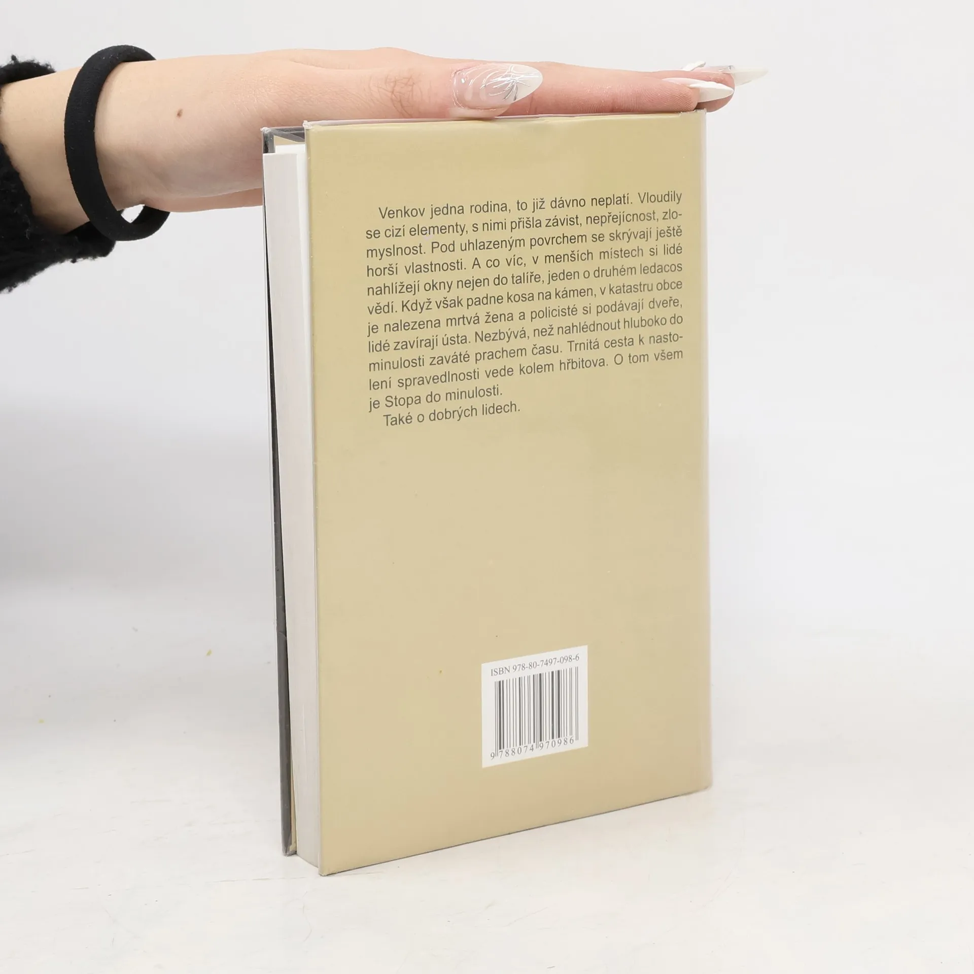 Venkov jedna rodina, to již dávno neplatí. Vloudily se cizí elementy, s nimi přišla závist, nepřejícnost, zlomyslnost. Pod uhlazeným povrchem se skrývají ještě horší vlastnosti. A co víc, v menších místech si lidé nahlížejí okny nejen do talíře, jeden o druhém ledacos vědí. Když však padne kosa na kámen, v katastru obce je nalezena mrtvá žena a policisté si podávají dveře, lidé zavírají ústa. Nezbývá, než nahlédnout hluboko do minulosti zaváté prachem času. Trnitá cesta k nastolení spravedlnosti vede kolem hřbitova. O tom všem je Stopa do minulosti. Také o dobrých lidech.