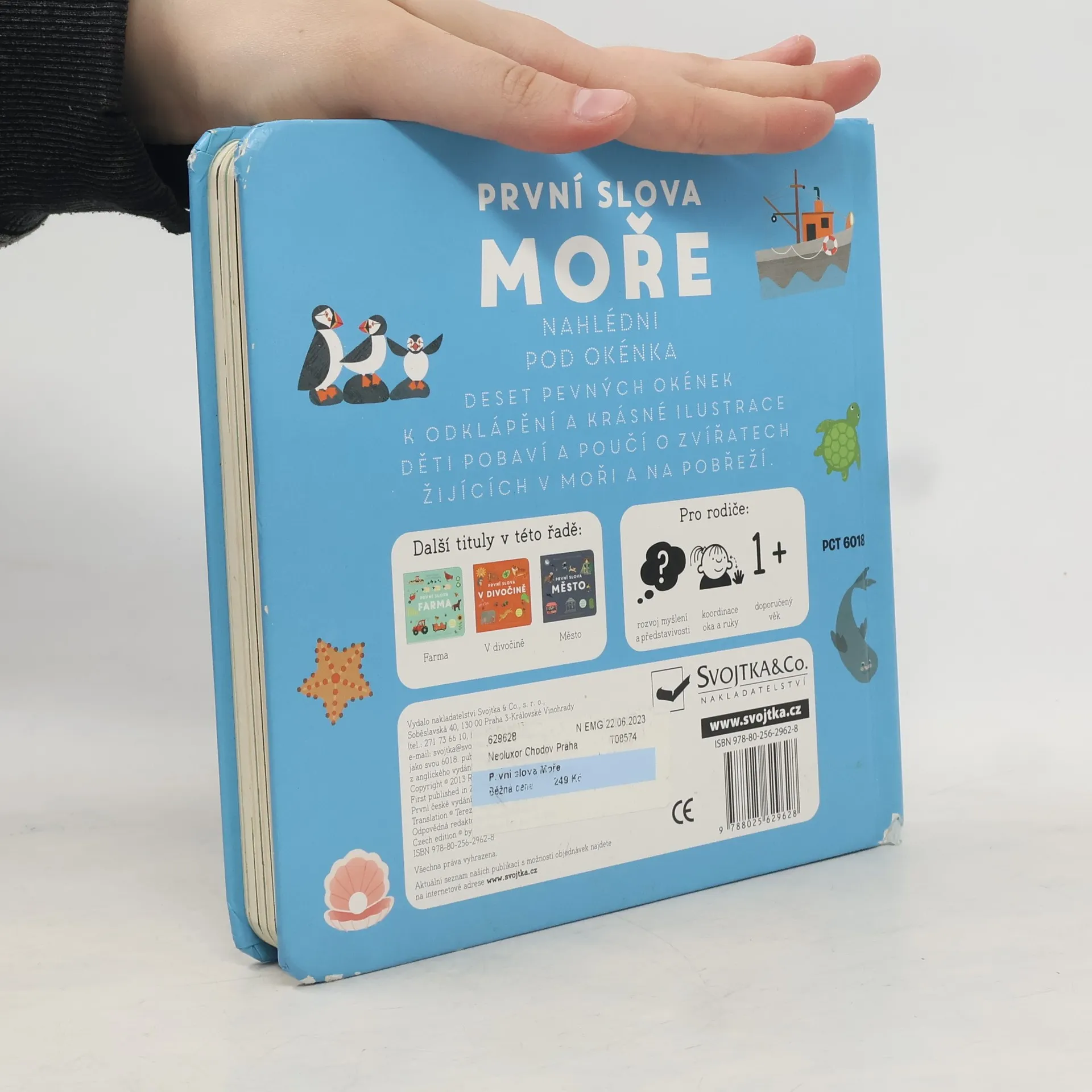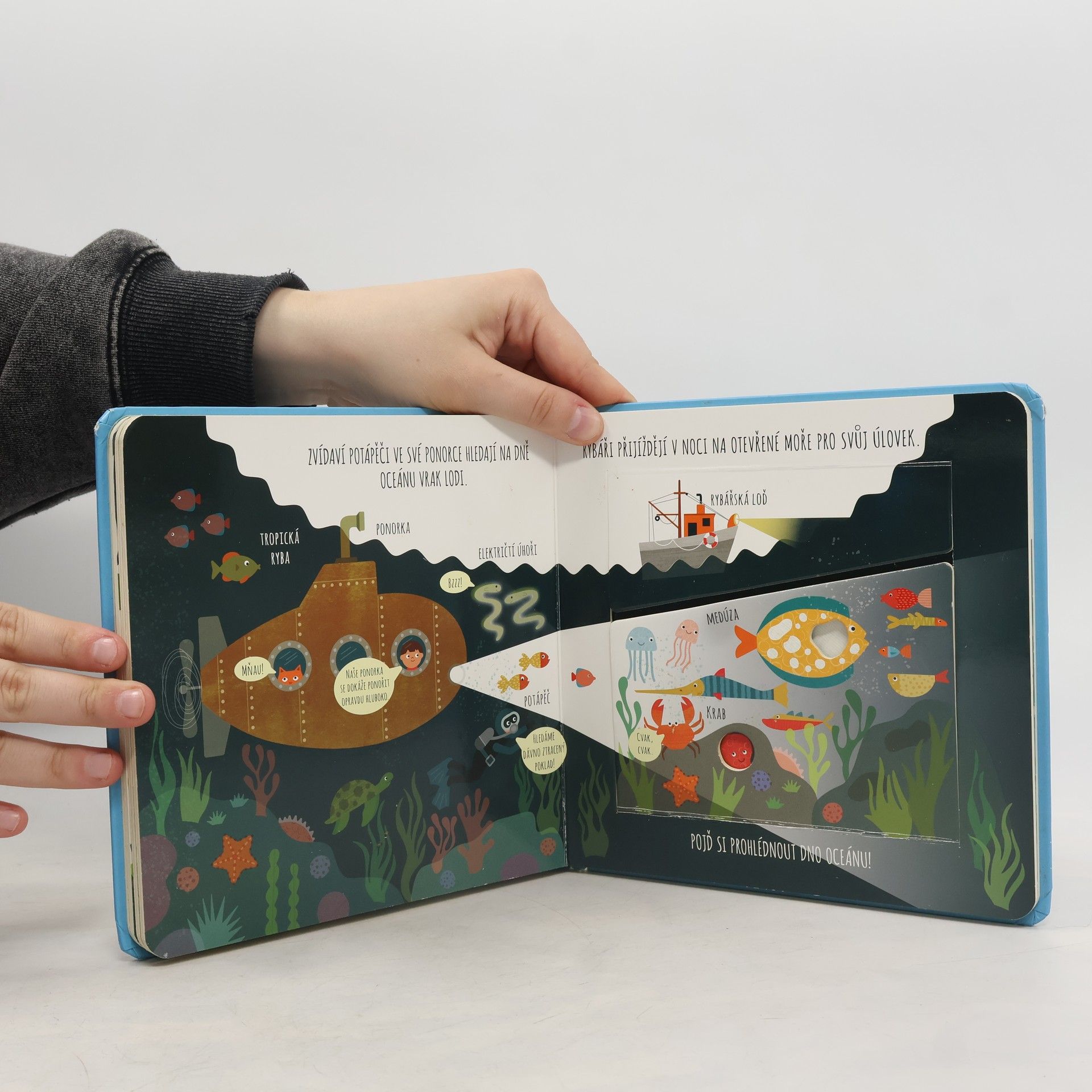 Interaktivní knížka s tuhými listy seznamuje děti s životem v moři a v blízkosti mořských břehů. Obrázky doplňují krátké popisky s informacemi o zvířatech i o prostředí, ve kterém se vyskytují.