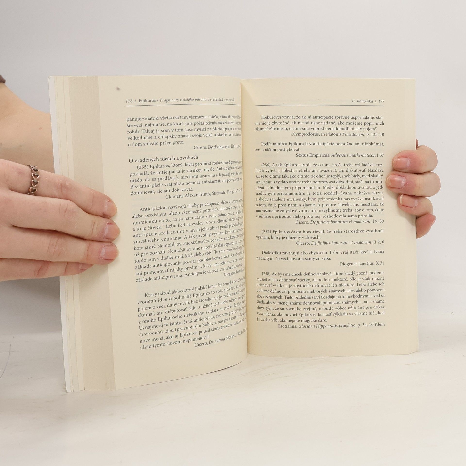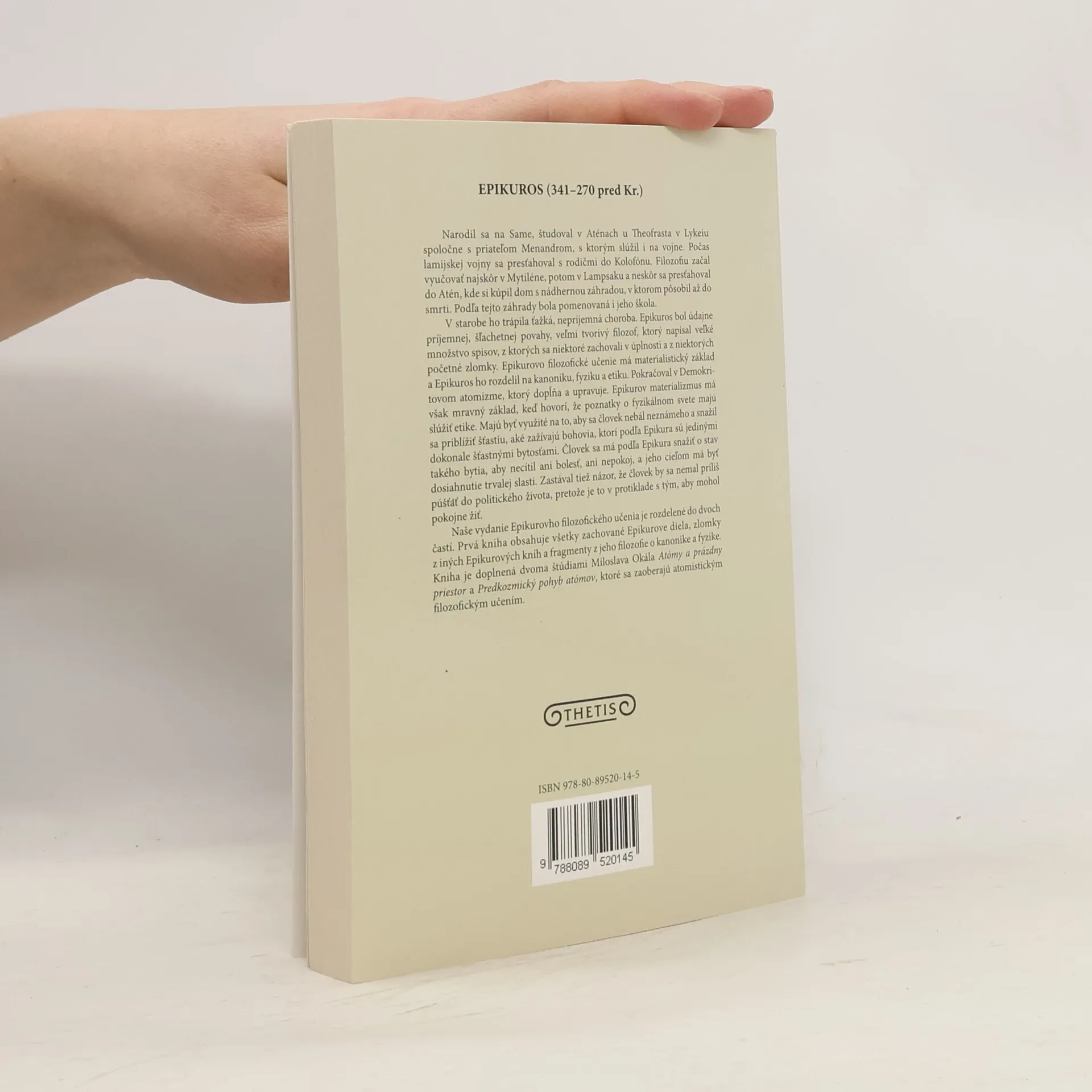 Naše vydanie Epikurovho filozofického učenia je rozdelené do dvoch častí. Prvá kniha obsahuje všetky zachované Epikurove diela, zlomky z iných Epikurových kníh a fragmenty z jeho filozofie o kanonike a fyzike. Kniha je doplnená dvoma štúdiami Miloslava Okála Atómy a prázdny priestor a Predkozmický pohyb atómov, ktoré sa zaoberajú atomistickým filozofickým učením.