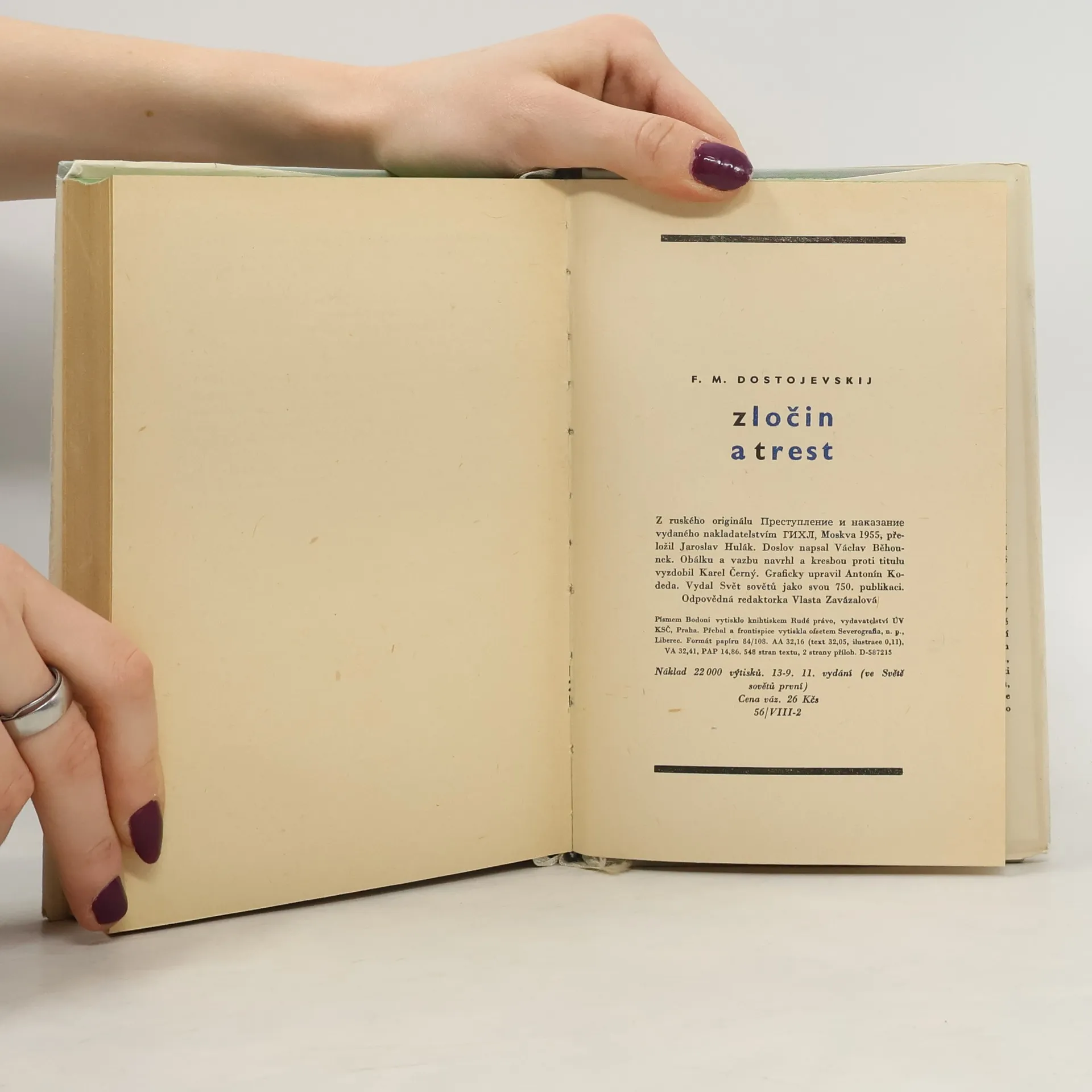 Proslulý román velkého ruského realisty sugestivně zachycuje chmurné prostředí petrohradské chudiny. V osudu hrdiny, Raskolnikova, který zavraždí lichvářku a poté dospívá k pokoře a nábožnosti, zobrazuje Dostojevský svůj odmítavý postoj nejen k individualistickému radikalismu, ale k revolučnímu úsilí vůbec. Doslov: Václav Běhounek