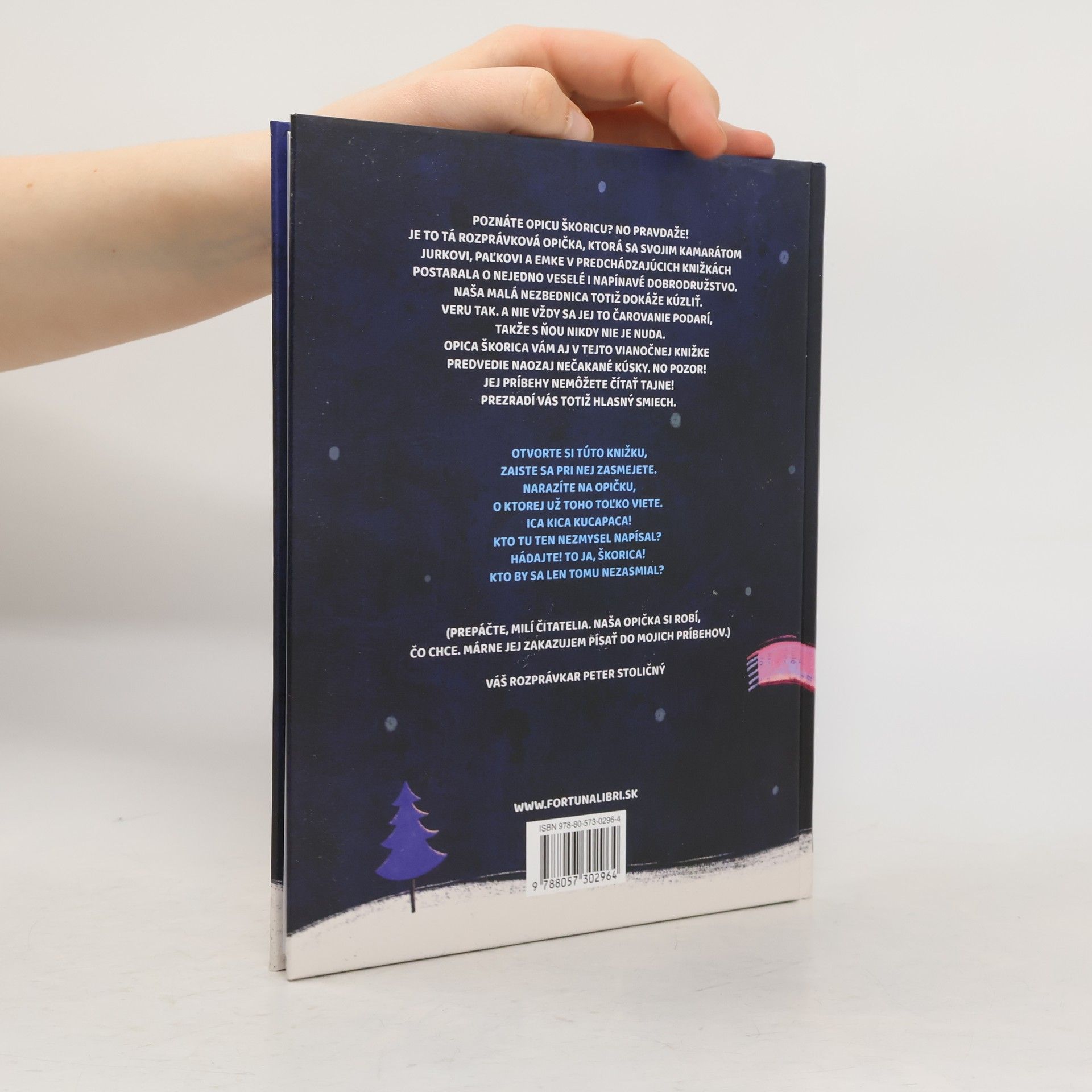 Poznáte opicu Škoricu? No pravdaže! Je to tá rozprávková opička, ktorá sa svojim kamarátom Jurkovi, Paľkovi a Emke v predchádzajúcich knižkách postarala o nejedno veselé i napínavé dobrodružstvo. Naša malá nezbednica totiž dokáže kúzliť. Veru tak. A nie vždy sa jej to čarovanie podarí, takže s ňou nikdy nie je nuda.Opica Škorica vám aj v tejto vianočnej knižke predvedie naozaj nečakané kúsky. No pozor! Jej príbehy nemôžete čítať tajne! Prezradí vás totiž hlasný smiech.Otvorte si túto knižku, zaiste sa pri nej zasmejete.Narazíte na opičku, o ktorej už toho toľko viete.Ica kica kucapaca!Kto tu ten nezmysel napísal?Hádajte! To ja, Škorica!Kto by sa len tomu nezasmial?(Prepáčte, milí čitatelia. Naša opička si robí, čo chce. Márne jej zakazujem písať do mojich príbehov.)Váš rozprávkar Peter Stoličný
