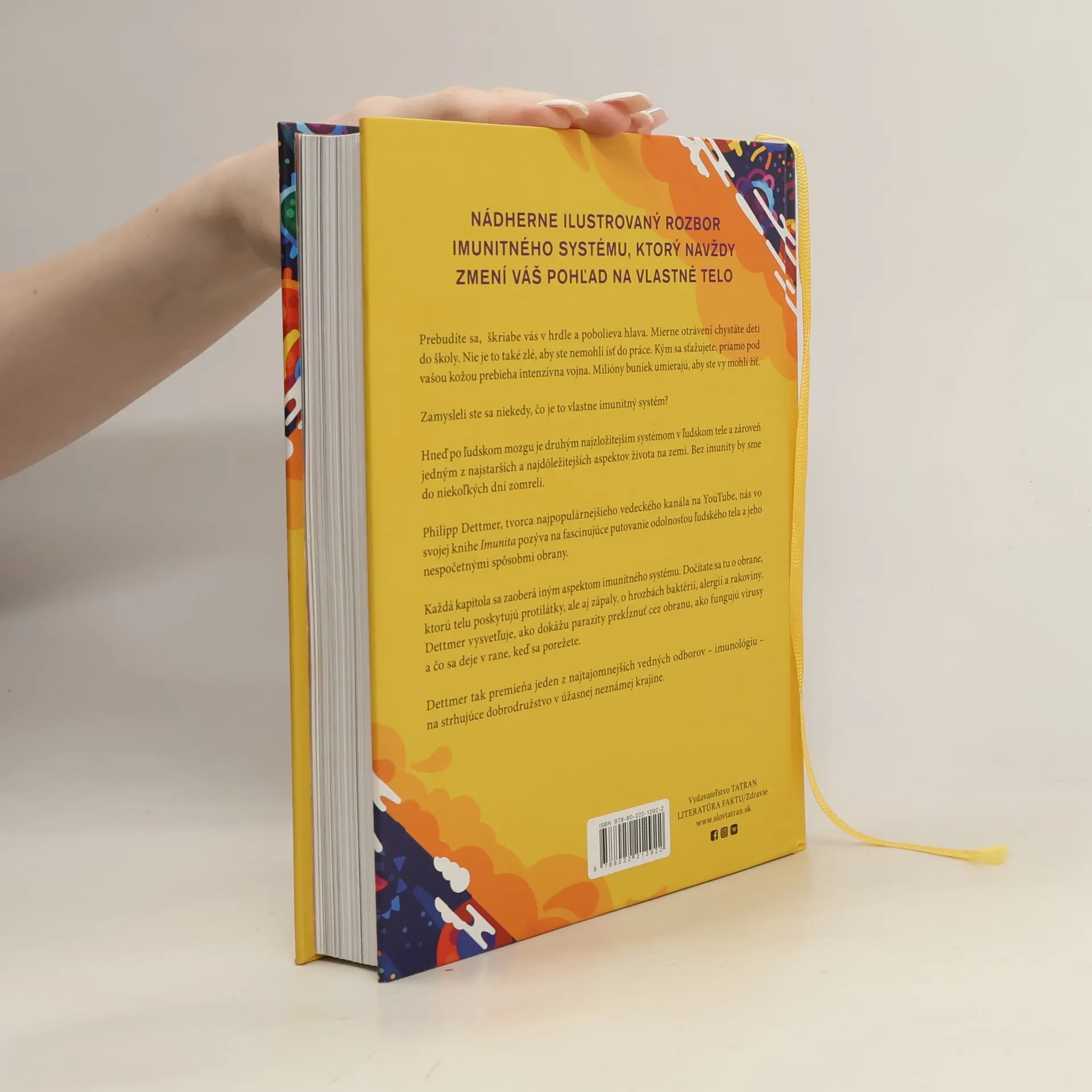 Prebudíte sa s bolesťou v hrdle a hlave, ale chystáte deti do školy a idete do práce. Kým sa sťažujete, vo vašom tele prebieha intenzívna vojna, kde milióny buniek umierajú, aby ste mohli žiť. Zamysleli ste sa niekedy, čo je imunitný systém? Hneď po mozgu je druhým najzložitejším systémom v tele a jedným z najstarších aspektov života. Bez imunity by sme zomreli za pár dní. Autor nás pozýva na fascinujúce putovanie odolnosťou ľudského tela a jeho obrannými mechanizmami. V tele prebieha zúrivý boj, kde miliardy imunitných buniek čelí choroboplodným mikroorganizmom a vytvára zložité obranné stratégie. Každá kapitola sa zaoberá iným aspektom imunitného systému, od protilátok a zápalov po hrozby baktérií, alergií a rakoviny. Dettmer vysvetľuje, ako parazity prekĺznu cez obranu a čo sa deje v rane pri porezaní. Kniha je dôvtipným a zábavným rýchlokurzom o práci tohto dôležitého systému, obohatená farebnými grafikami a pútavými opismi, ktoré premieňajú imunológiu na strhujúce dobrodružstvo.
