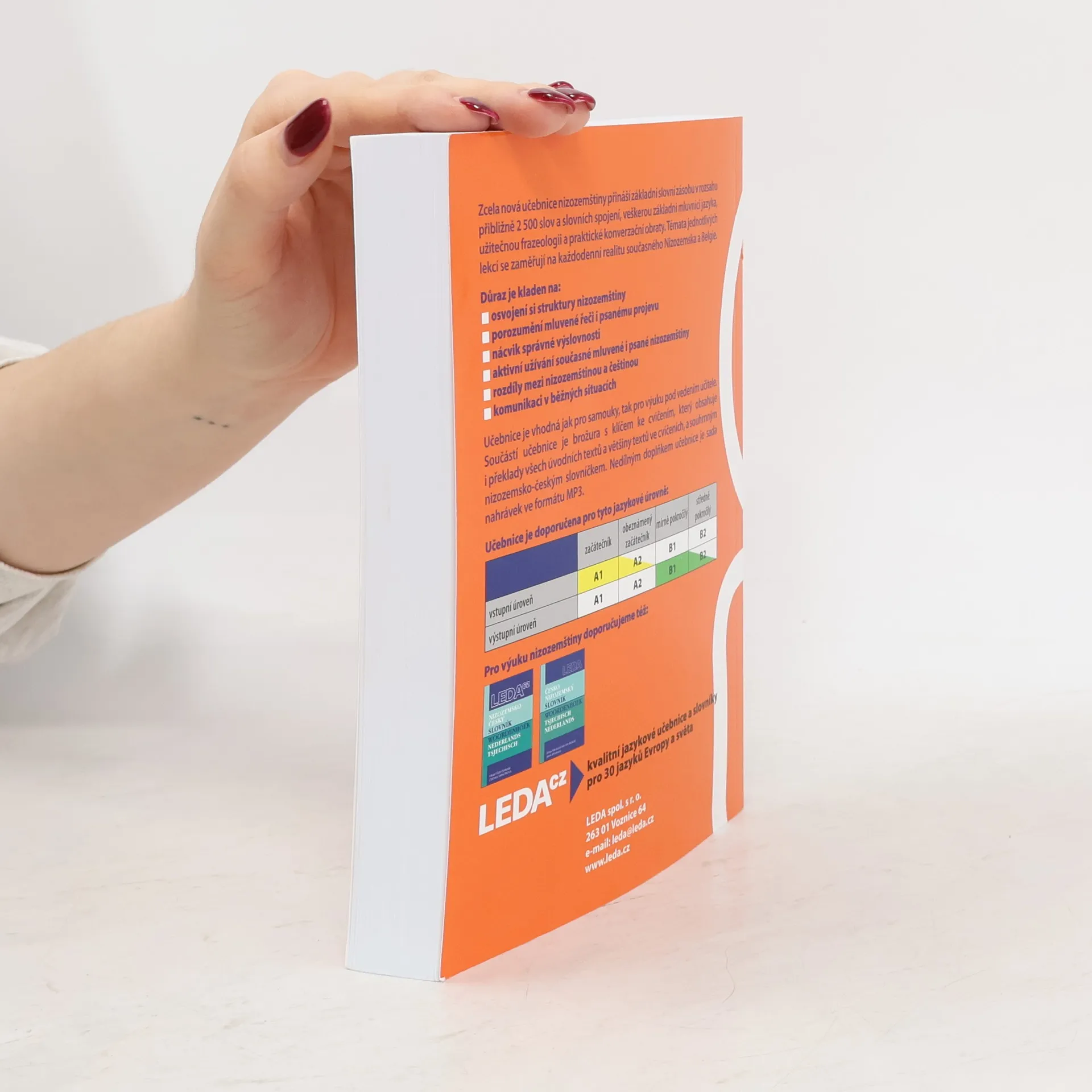 Zcela nová učebnice nizozemštiny přináší základní slovní zásobu v rozsahu přibližně 2 500 slov a slovních spojení, veškerou základní mluvnici jazyka, užitečnou frazeologii a praktické konverzační obraty. Témata jednotlivých lekcí se zaměřují na každodenní realitu současného Nizozemska a Belgie. Důraz je kladen na: • osvojení si struktury nizozemštiny • porozumění mluvené řeči i psanému projevu • nácvik správné výslovnosti • aktivní užívání současné mluvené i psané nizozemštiny • rozdíly mezi nizozemštinou a češtinou • komunikaci v běžných situacích Učebnice je vhodná jak pro samouky, tak pro výuku pod vedením učitele. Součástí učebnice je brožura s klíčem ke cvičením, který obsahuje i překlady všech úvodních textů a většiny nizozemských textů ve cvičeních, a souhrnným nizozemsko-českým slovníčkem. Nedílným doplňkem učebnice je sada nahrávek ve formátu MP3.