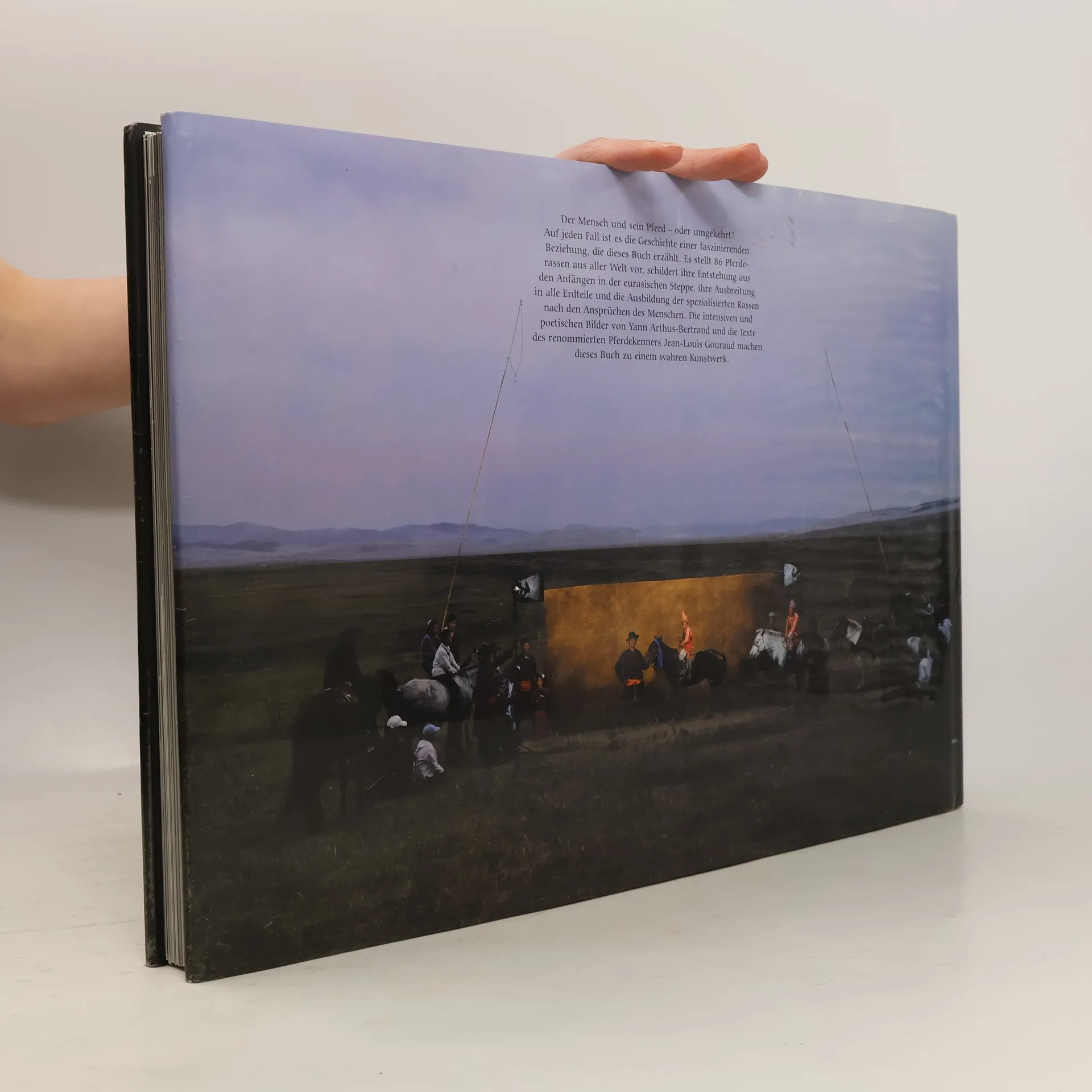 Der Mensch und sein Pferd – oder ist es eher umgekehrt? Diese faszinierende Beziehung wird in diesem Buch eindrucksvoll erzählt. Es präsentiert 86 Pferderassen aus aller Welt und beschreibt deren Entstehung in der eurasischen Steppe, ihre weltweite Verbreitung und die Entwicklung spezialisierter Rassen, die den Bedürfnissen des Menschen entsprechen. Die einzigartigen Bilder von Yann Arthus-Bertrand und die Texte des Pferdekenners Jean-Louis Gouraud verwandeln das Buch in ein Kunstwerk. Arthus-Bertrand, der seit zwanzig Jahren Tiere fotografiert, wählt für seine Hommage an das Pferd einen besonderen Blickwinkel: Er porträtiert die Tiere als eigenständige Persönlichkeiten und zeigt sie zusammen mit den Menschen, die ihr Leben prägen – Besitzern, Ausbildern, Pflegern und Reitern. Die wechselseitige Beziehung zwischen Mensch und Pferd ist über Jahrtausende gewachsen, wobei der Mensch die Rassen nach seinen Bedürfnissen formte. Diese Entwicklung ist auch ein Teil der Kulturgeschichte. Yann Arthus-Bertrand und Jean-Louis Gouraud erzählen sie mit sinnlichen, teils komischen Bildern und tiefgründigen Texten. Sie zeigen das von Respekt und Zärtlichkeit geprägte Verhältnis zwischen Pferden und ihren Bezugspersonen, deren Stolz, Würde und Liebe. Ein strahlendes Denkmal für die Beziehung von Mensch und Pferd.