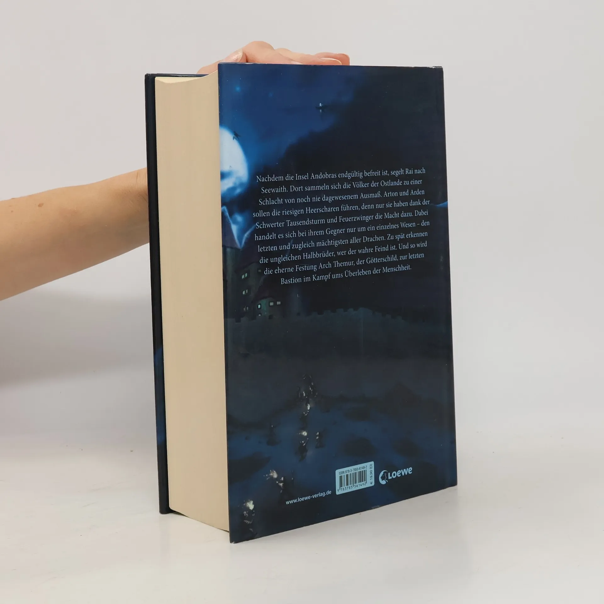 Nachdem die Insel Andobras endgültig befreit ist, segelt Rai nach Seewaith. Dort sammeln sich die Völker der Ostlande zu einer Schlacht von noch nie dagewesenem Ausmaß. Arton und Arden sollen die riesigen Heerscharen führen, denn nur sie haben dank der Schwerter Tausendsturm und Feuerzwinger die Macht dazu. Dabei handelt es sich bei ihrem Gegner nur um ein einzelnes Wesen – den letzten und zugleich mächtigsten aller Drachen. Zu spät erkennen die ungleichen Halbbrüder, wer der wahre Feind ist. Und so wird die eherne Festung Arch Themur, der Götterschild, zur letzten Bastion im Kampf ums Überleben der Menschheit.