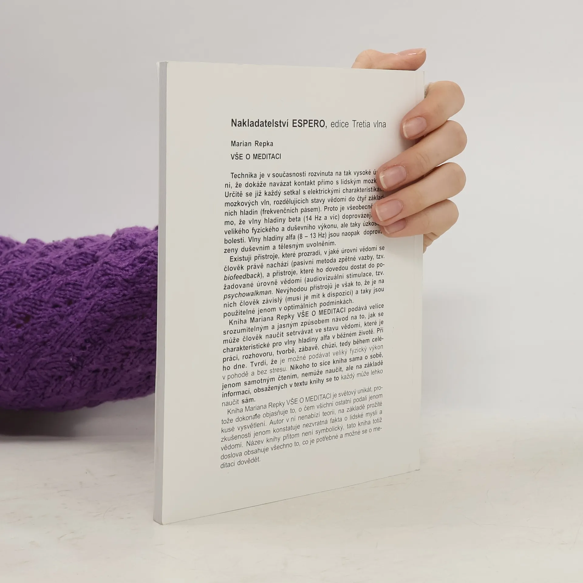 Technika dosáhla tak vysoké úrovně, že dokáže navázat kontakt přímo s lidským mozkem. Každý se jistě setkal s elektrickými charakteristikami mozkových vln, které rozdělují stavy vědomí do čtyř základních hladin. Vlny hladiny beta (14 Hz a více) jsou spojeny se silným fyzickým a duševním výkonem, ale také s úzkostí. Naopak vlny hladiny alfa (8-13 Hz) přinášejí duševní a tělesné uvolnění. Existují přístroje, které ukazují, v jaké úrovni vědomí se člověk nachází (biofeedback), a také přístroje, které pomáhají dosáhnout požadované úrovně (audiovizuální stimulace). Nevýhodou těchto přístrojů je závislost na nich a nutnost optimálních podmínek. Kniha Mariana Repky nabízí jasný návod, jak se naučit setrvávat ve stavu vědomí charakteristickém pro vlny hladiny alfa v každodenním životě. Autor tvrdí, že je možné dosahovat vysokého fyzického výkonu bez stresu. Kniha sama o sobě čtenáře nenaučí, ale na základě informací v textu se to každý může snadno naučit sám. Tento světový unikát detailně objasňuje témata, o kterých ostatní pouze naznačili. Autor se opírá o prožité zkušenosti a konstatuje fakta o lidské mysli a vědomí. Název knihy není symbolický; obsahuje vše, co je potřeba vědět o meditaci.