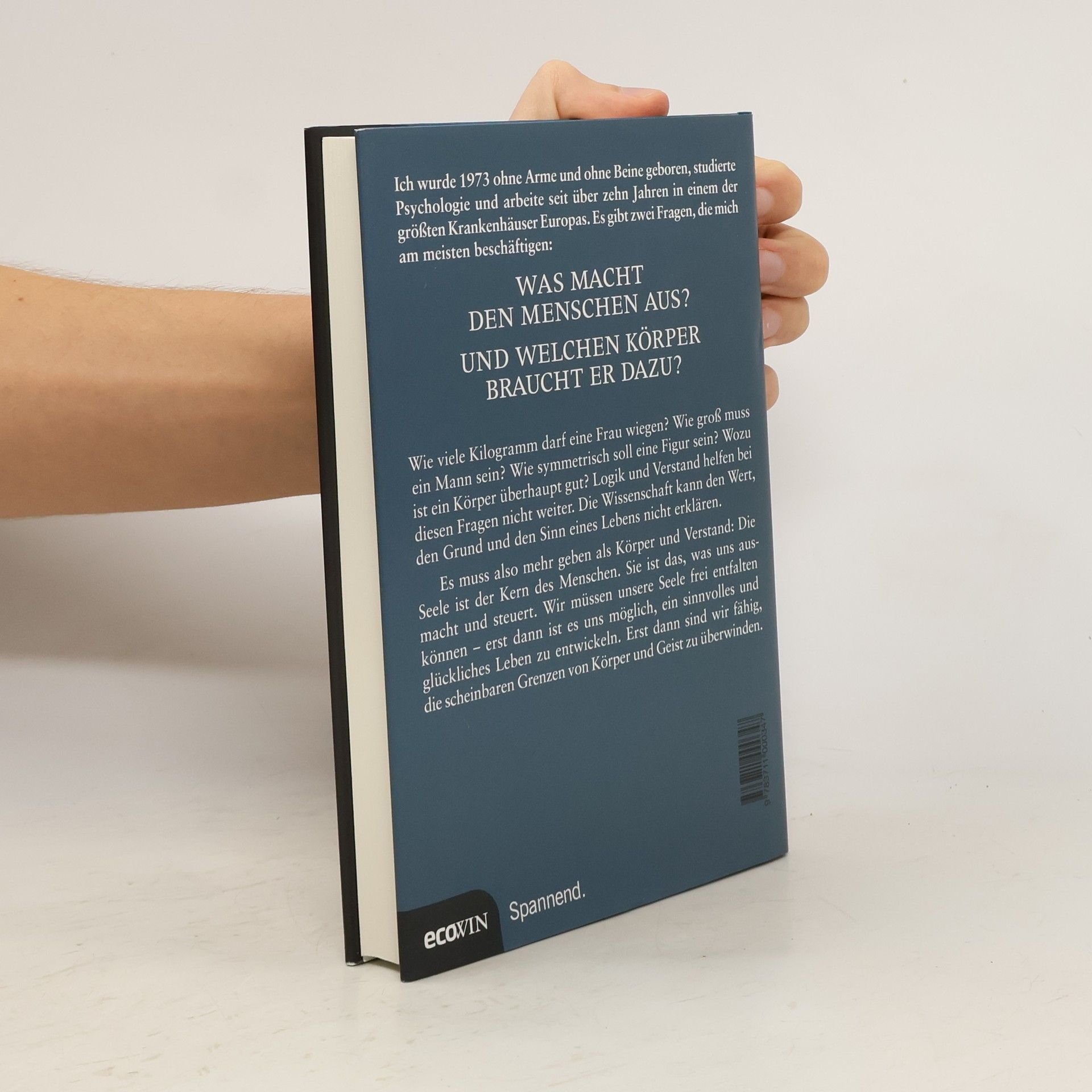 Ich wurde 1973 ohne Arme und ohne Beine geboren, studierte Psychologie und arbeite seit über zehn Jahren an einem der größten Krankenhäuser Europas. Es gibt zwei Fragen, die mich am meisten beschäftigten: Was macht den Menschen aus? Und welchen Körper braucht er dazu? Wie viel Kilogramm darf eine Frau wiegen? Wie groß muss ein Mann sein? Wie symmetrisch soll eine Figur sein? Wozu ist ein Körper überhaupt gut? Logik und Verstand helfen bei diesen Fragen nicht weiter. Die Wissenschaft kann den Wert, den Grund und den Sinn eines Lebens nicht erklären. Es muss also mehr geben als Körper und Verstand: Die Seele ist der Kern des Menschen. Sie ist das, was uns ausmacht und steuert. Wir müssen unsere Seele frei entfalten können – erst dann ist es uns möglich, ein sinnvolles und glückliches Leben zu entwickeln. Erst dann sind wir fähig, die scheinbaren Grenzen von Körper und Geist zu überwinden.
