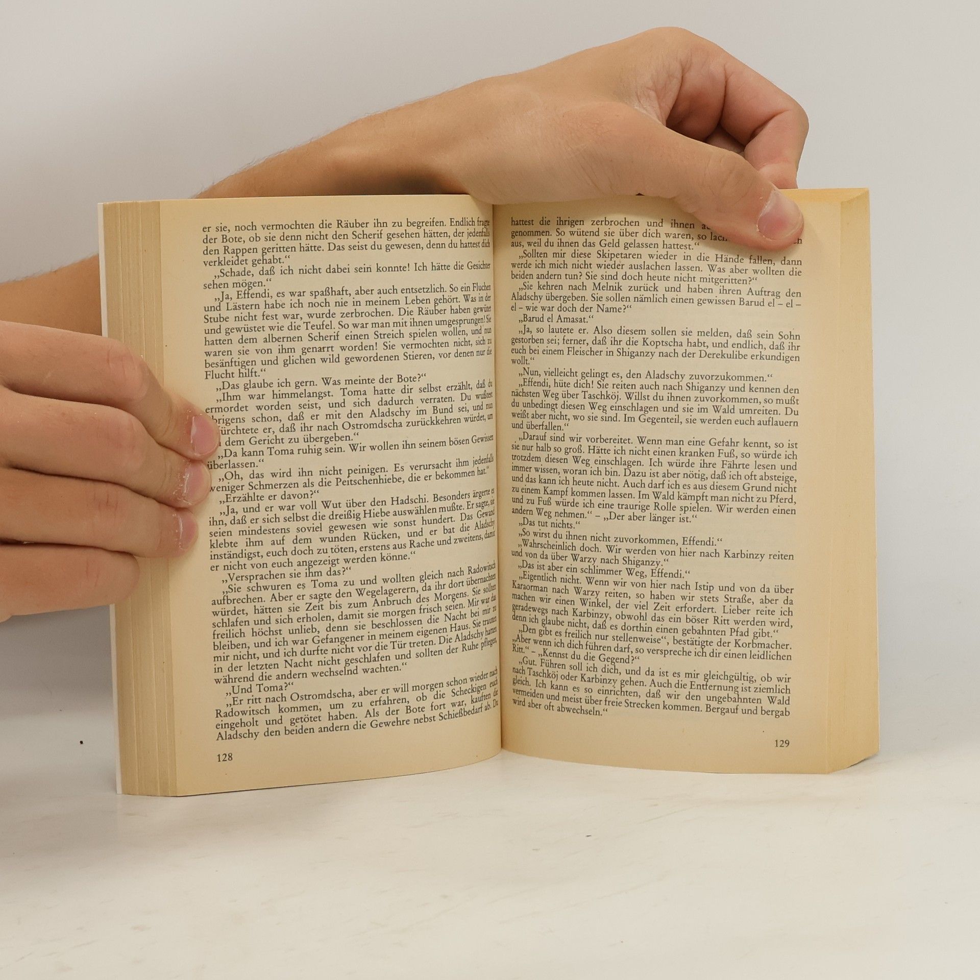 Durch das Land der Skipetaren folgen Kara Ben Nemsi und seine Gefährten den Spuren der Verbrecher. Dabei begegnen sie unversehens den beiden gefürchteten „Aladschy“, gelangen zur „Schluchthütte“, die ihnen zur Falle werden soll, und erleben eine ebenso dramatische wie lustige Episode im „Turm der alten Mutter“.