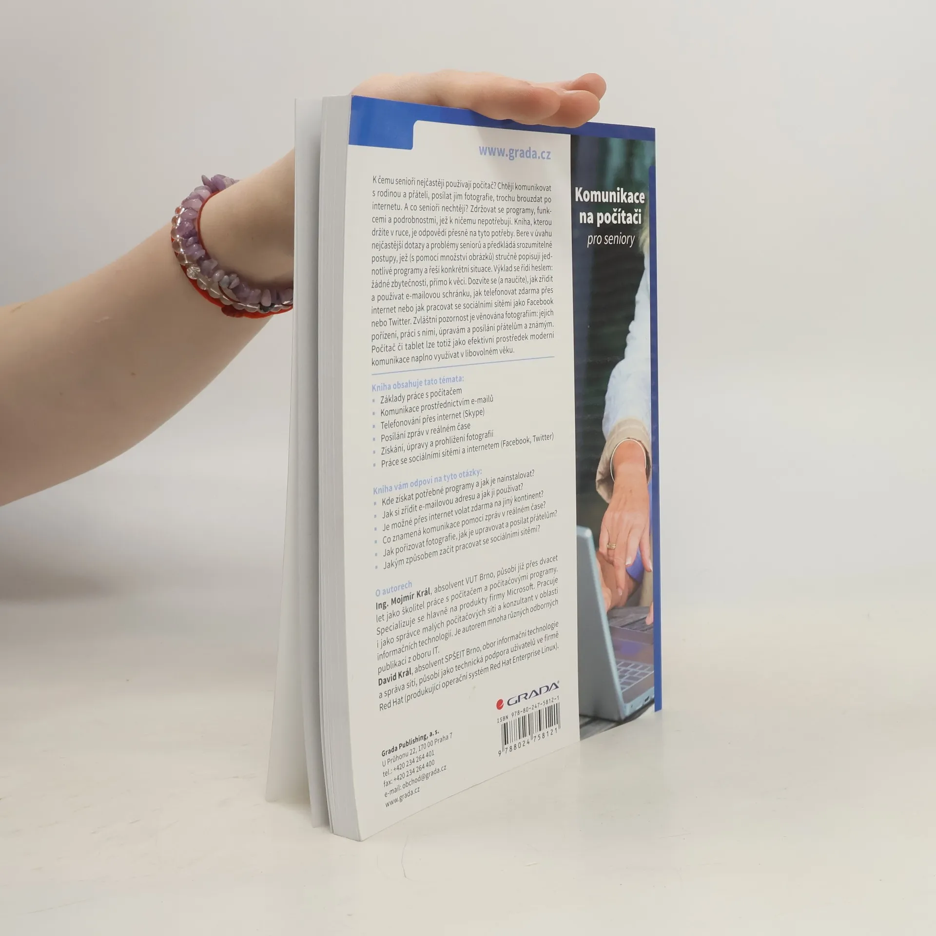 Kniha, kterou držíte v ruce, dává odpovědi všem, kdo chtějí komunikovat s rodinou a přáteli, posílat jim fotografie, trochu brouzdat po internetu a zároveň se nechtějí zdržovat s programy, funkcemi a dalšími "počítačovými" podrobnostmi. Bere v úvahu nejčastější dotazy a problémy seniorů a předkládá srozumitelné postupy, jež (s pomocí množství obrázků) stručně popisují jednotlivé programy a řeší konkrétní situace. Výklad se řídí heslem: žádné zbytečnosti, přímo k věci. Dozvíte se (a naučíte), jak zřídit a používat e-mailovou schránku, jak telefonovat zdarma přes internet nebo jak pracovat se sociálními sítěmi jako Facebook nebo Twitter. Zvláštní pozornost je věnována fotografiím: jejich pořízení, práci s nimi, úpravám a posílání přátelům a známým. Počítač či tablet lze totiž jako efektivní prostředek moderní komunikace naplno využívat v libovolném věku. V knize najdete odpovědi na tyto otázky: Kde získat potřebné programy a jak je nainstalovat? Jak si zřídit e-mailovou adresu a jak ji používat? Je možné přes internet volat zdarma na jiný kontinent? Co znamená komunikace pomocí zpráv v reálném čase? Jak pořizovat fotografie, jak je upravovat a posílat přátelům? Jakým způsobem začít pracovat se sociálními sítěmi?