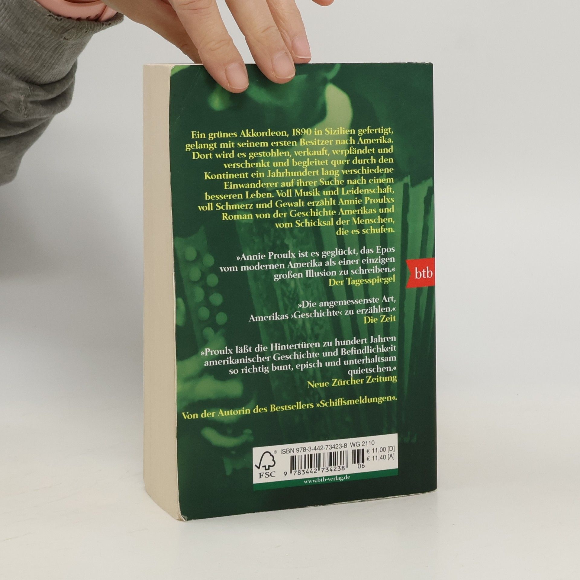 Die Odysse eines Akkordeons durch 100 Jahre amerikanische Geschichte. Ein grünes Akkordeon, 1890 in Sizilien gefertigt, gelangt mit seinem ersten Besitzer nach Amerika. Fast 100 Jahre lang erlebt es eine Odyssee durch den Kontinent, wird gestohlen, verkauft, verpfändet und verschenkt und begleitet die Nachfahren verschiedener Einwanderersippen auf ihrer Suche nach einem besseren Leben. Der Roman, voll Musik und Leidenschaft, voll Schmerz und Gewalt, erzählt von der Geschichte Amerikas und vom Schicksal der Menschen, die es schufen.
